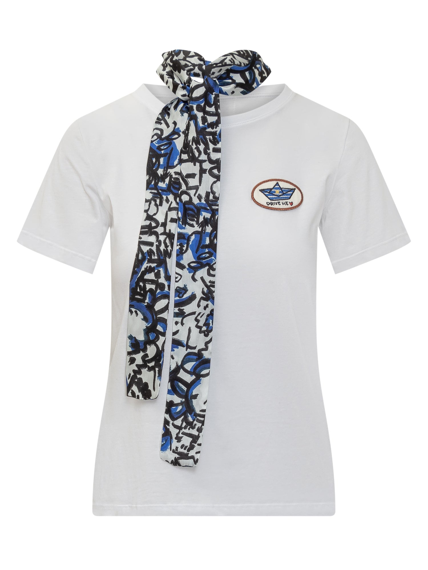Short-sleeved cotton T-shirt. Round neck with scarf. Ribbed hem. Logo on the front.