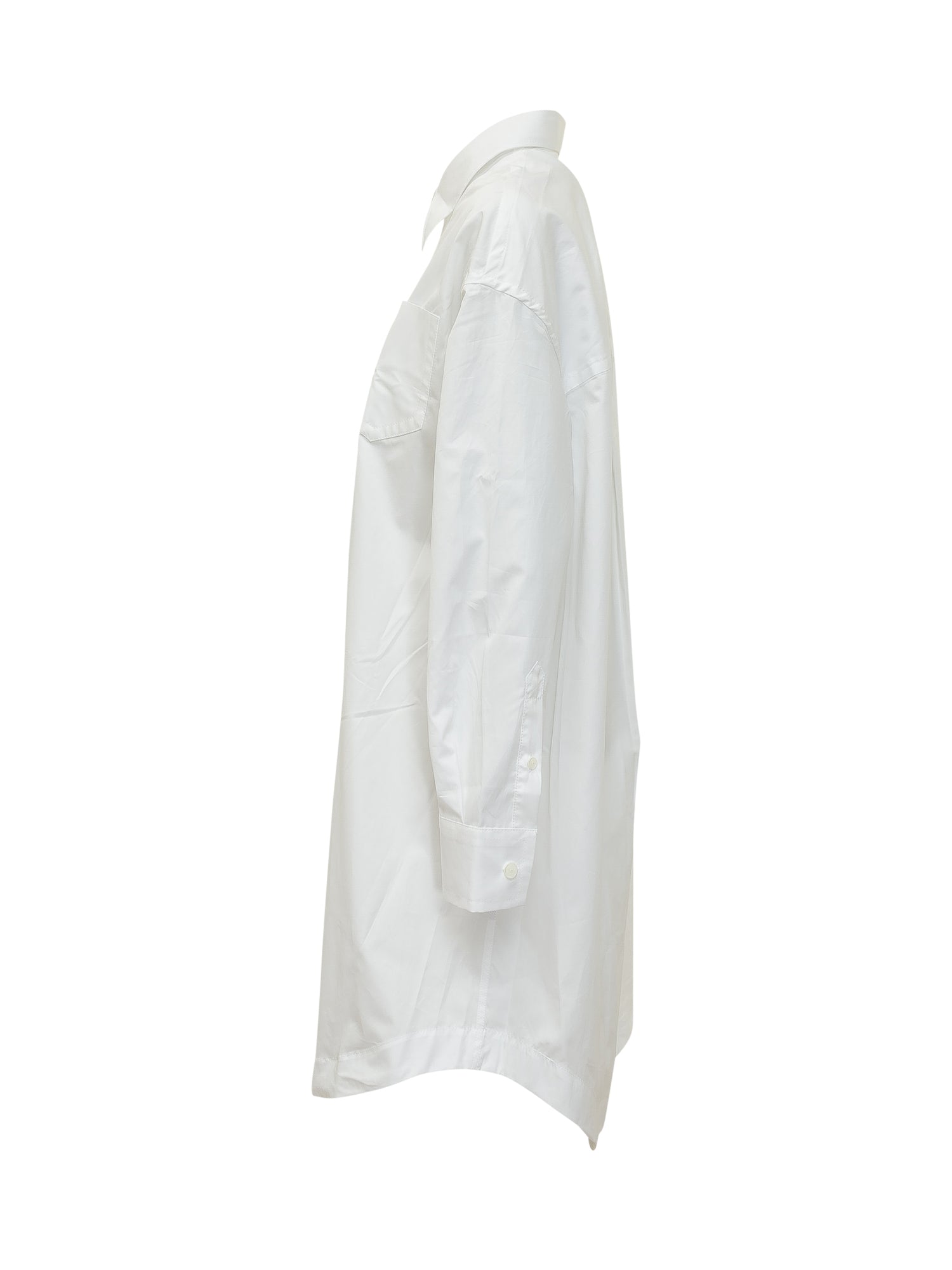 Long shirt dress with classic collar and front button closure. Long sleeves with cuffs and chest patch pocket. Wide silhouette for a contemporary look.