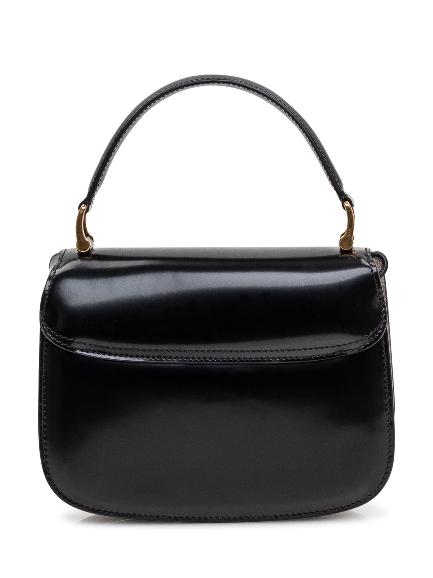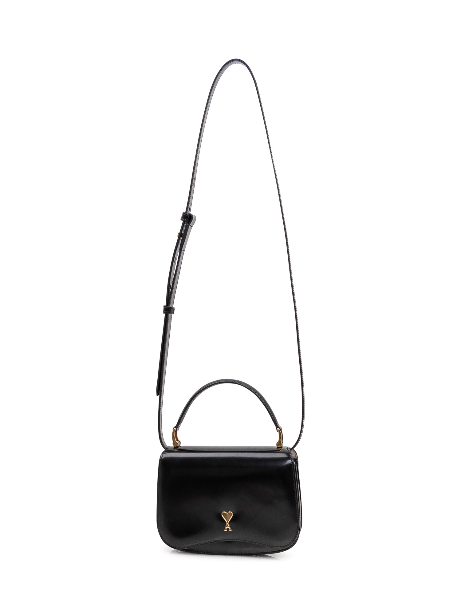 Top handle bag with front flap and metal heart logo closure. Compact structure with rounded profile and structured top handle. Defined design with logo detail applied on the front.