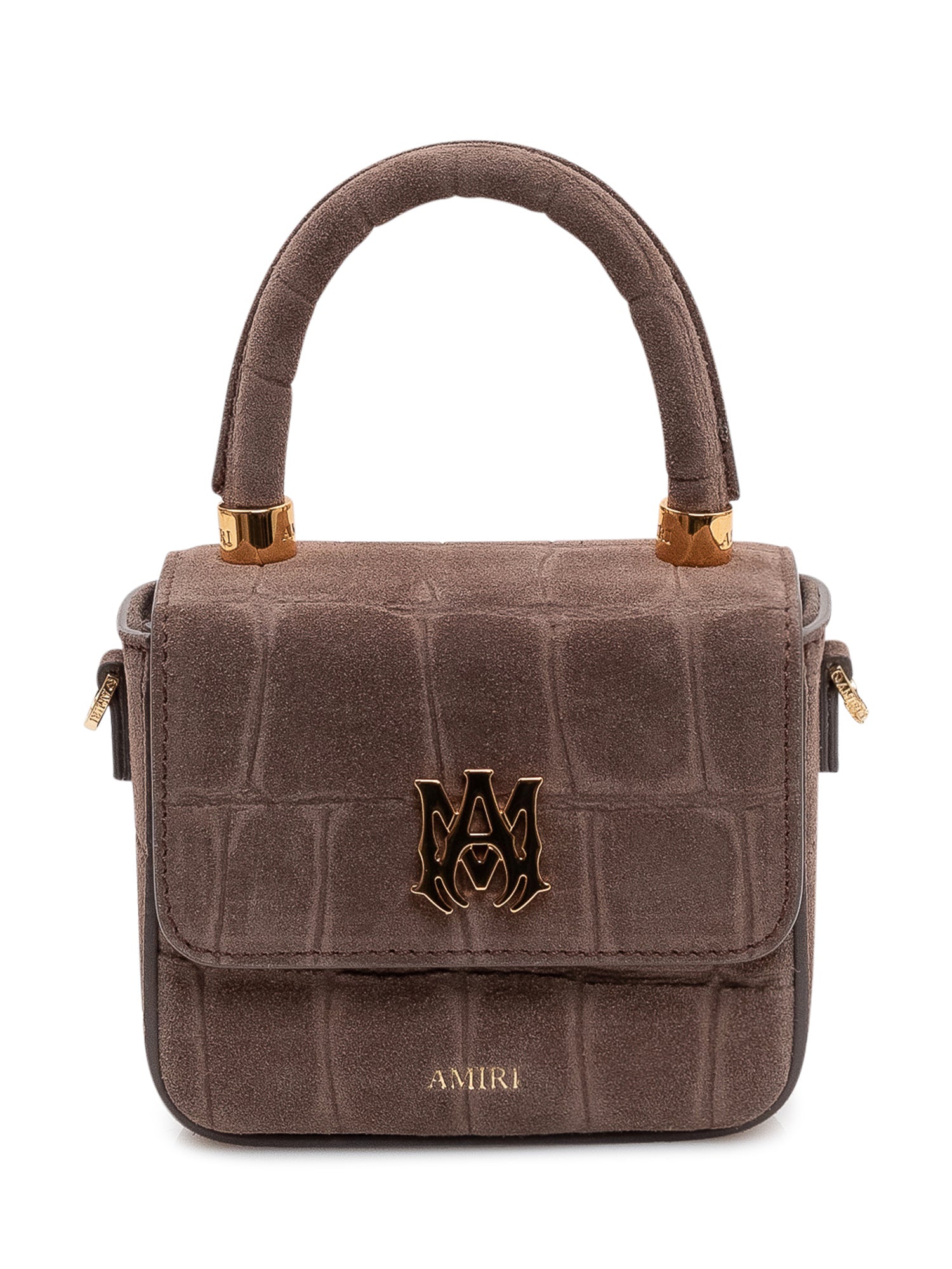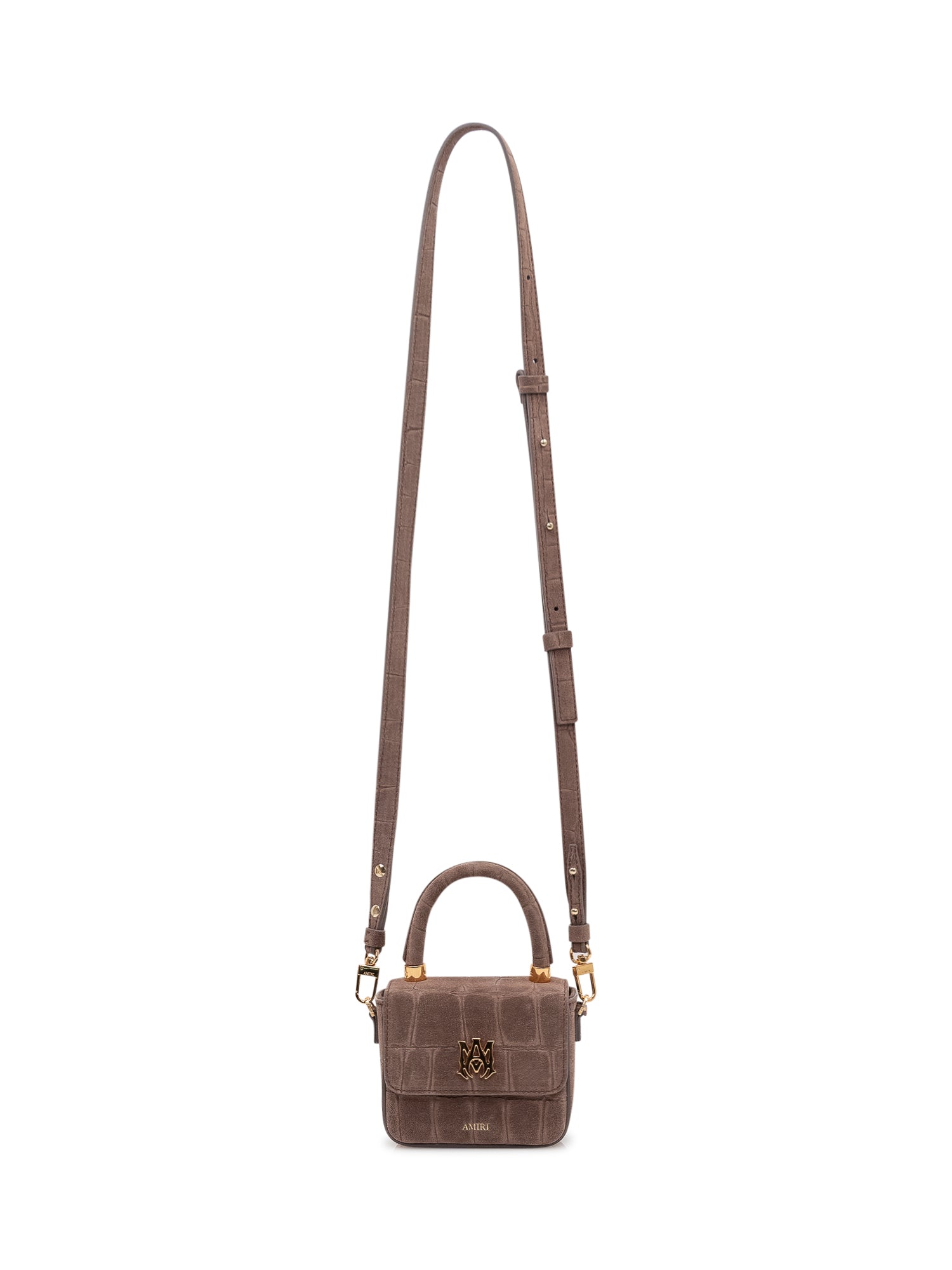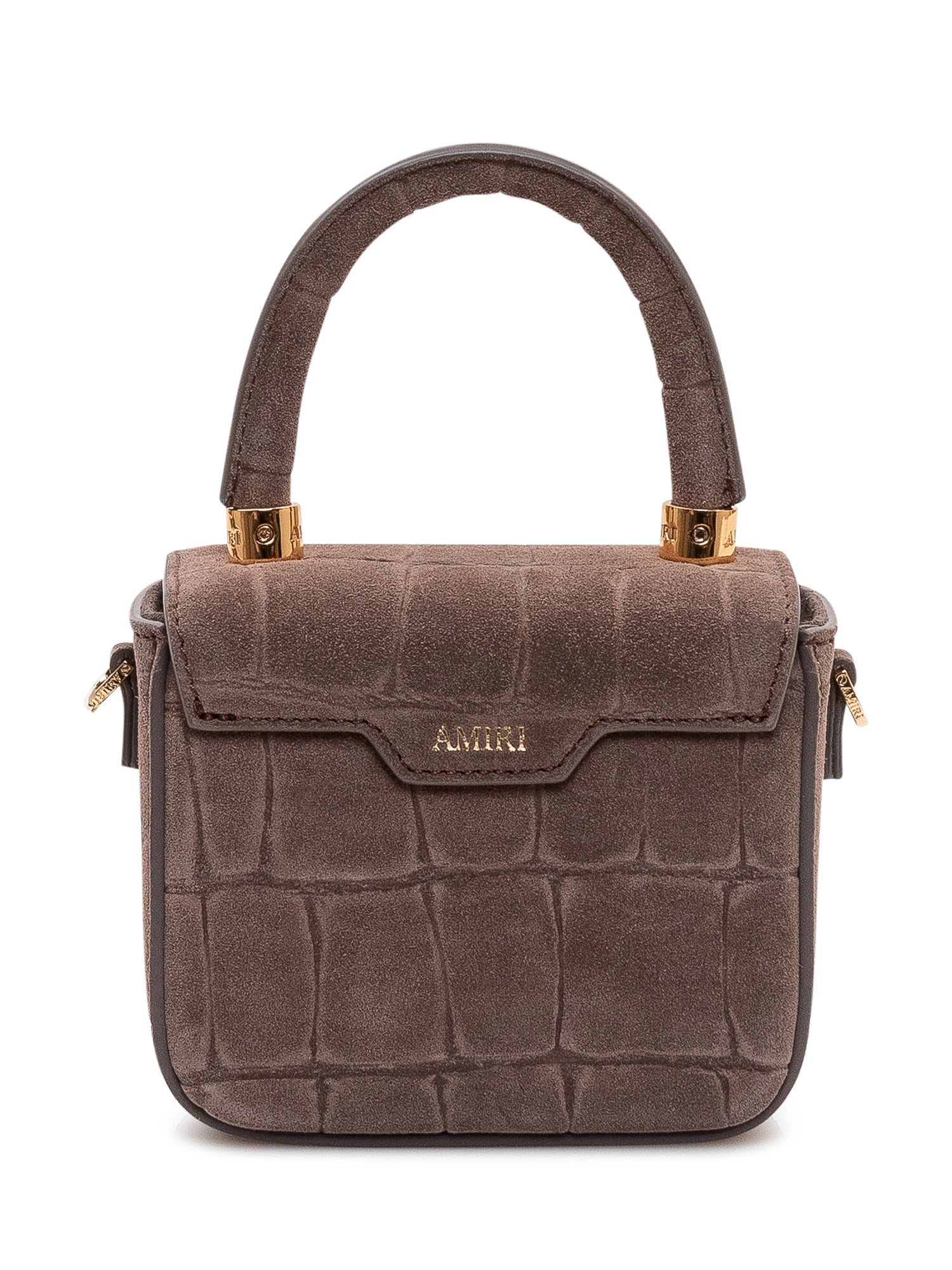 Nano bag crafted from suede with a crocodile-effect texture, featuring a structured top handle, front flap, and applied metal logo detail. Its compact and refined size makes it ideal for special occasions or for carrying essentials in style.