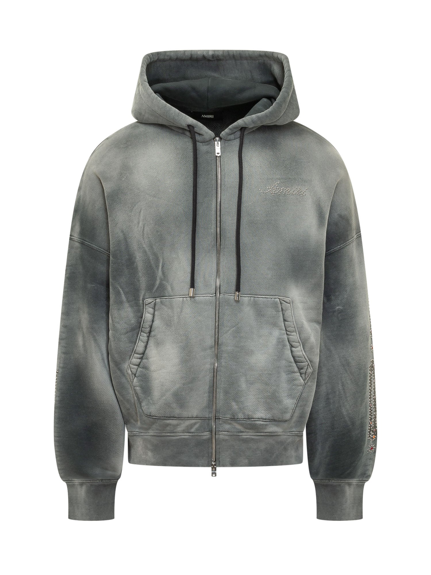 Hoodie with adjustable drawstring hood, front zip closure and kangaroo pocket. Logo on the chest and decorative applications on the sleeve, elasticated hem and cuffs with visible stitching.