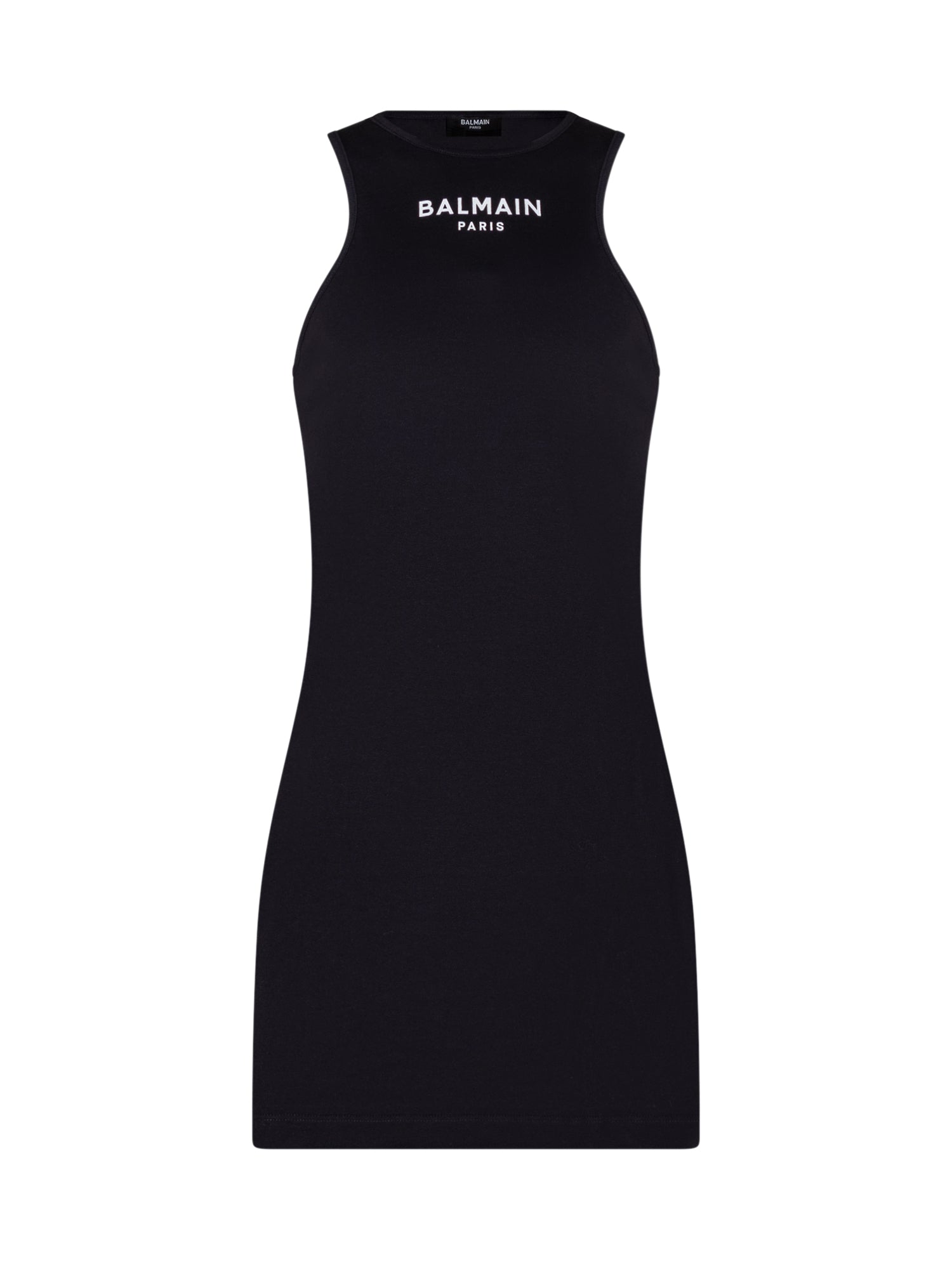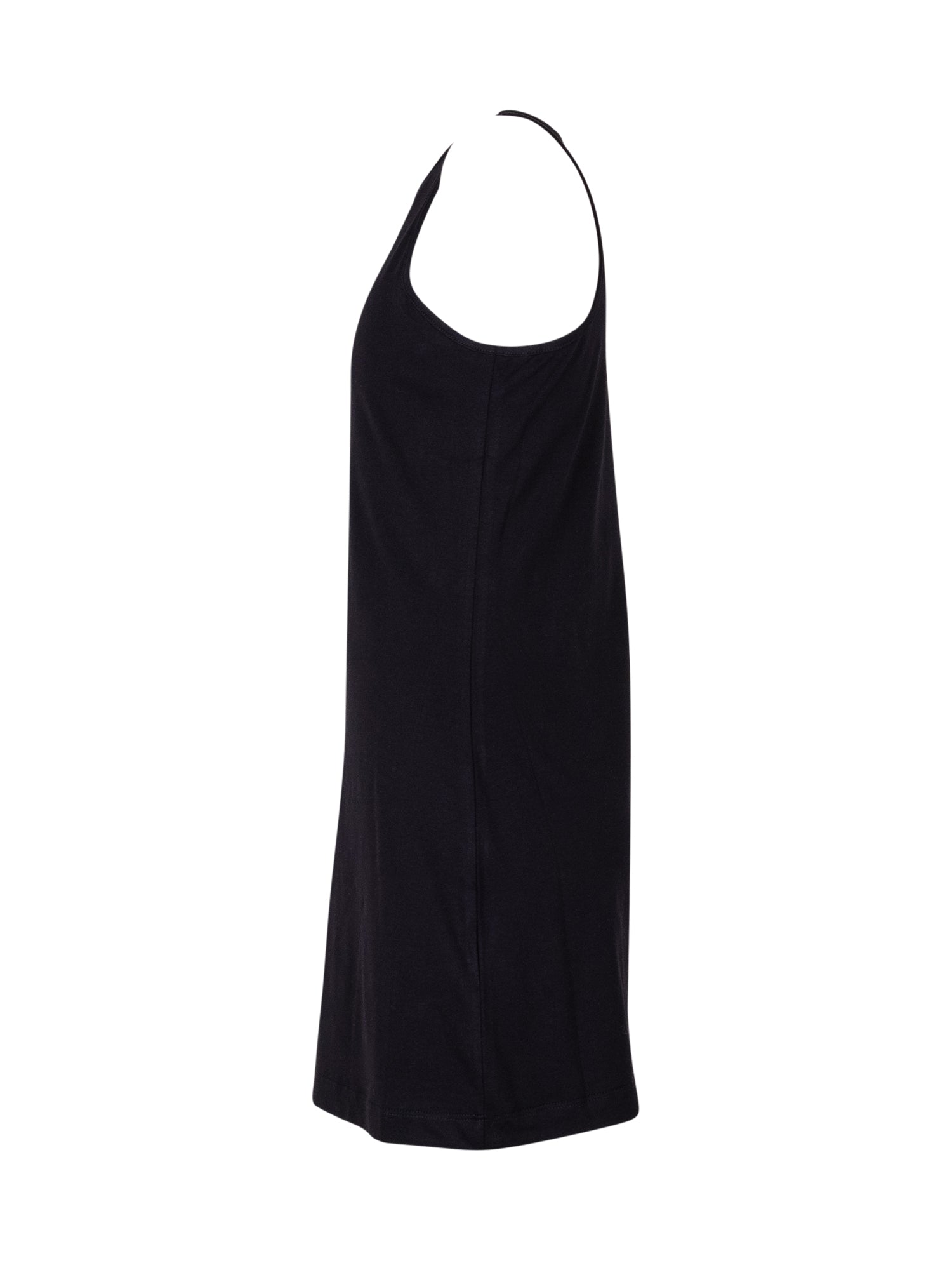 Sleeveless jersey dress featuring a fitted silhouette and classic crew neck. Minimal design enhanced by a contrasting logo print on the front. Perfect for a casual look with a bold attitude.