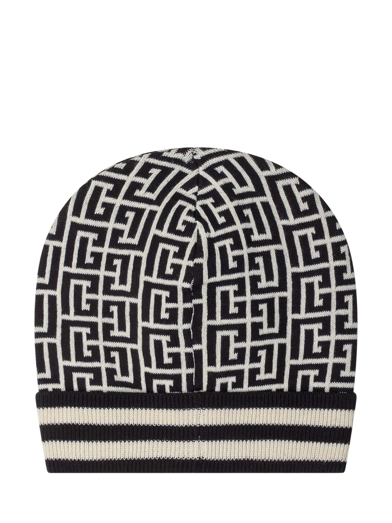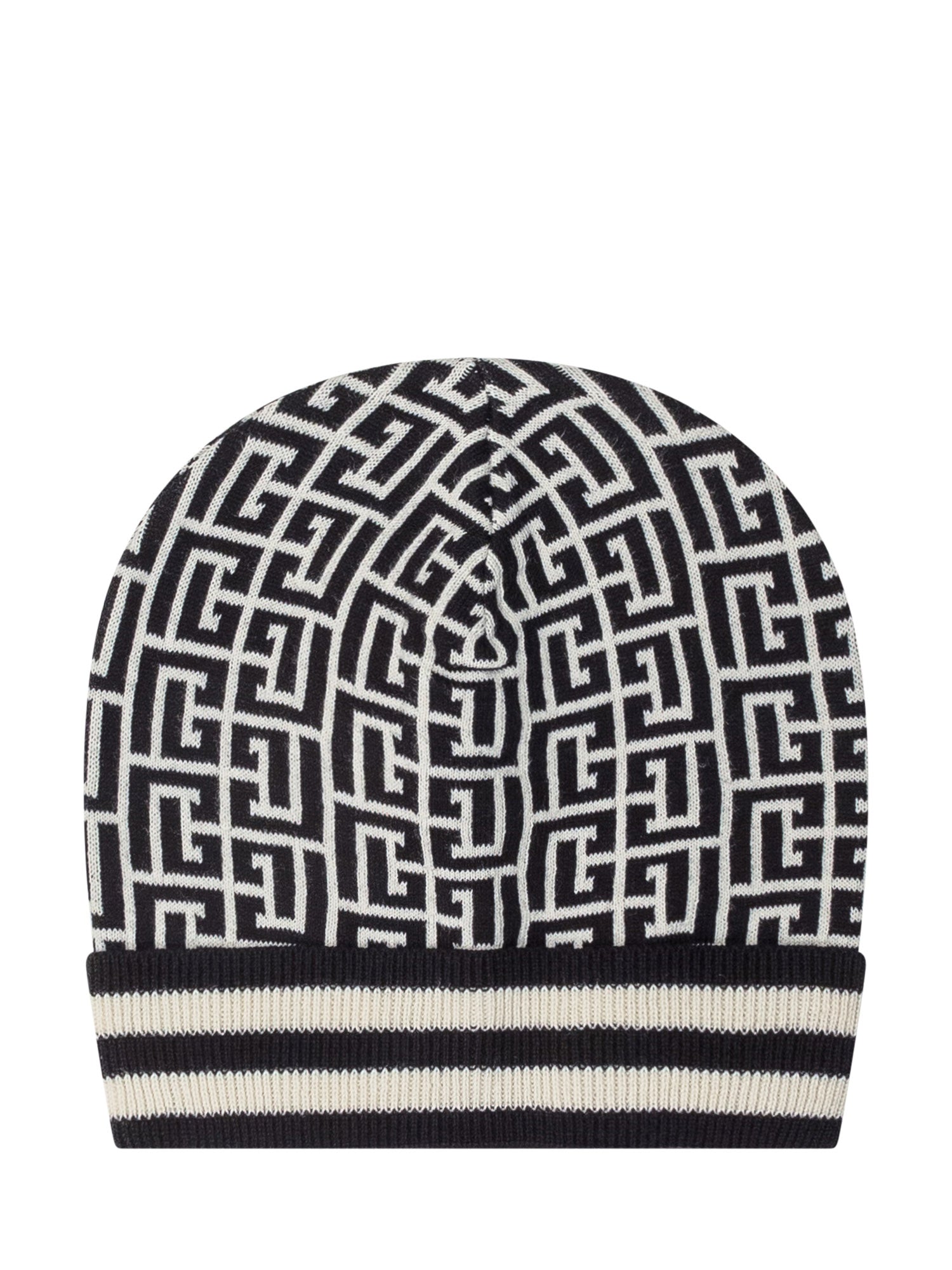Balmain beanie with all-over black and white monogram pattern and striped cuff.