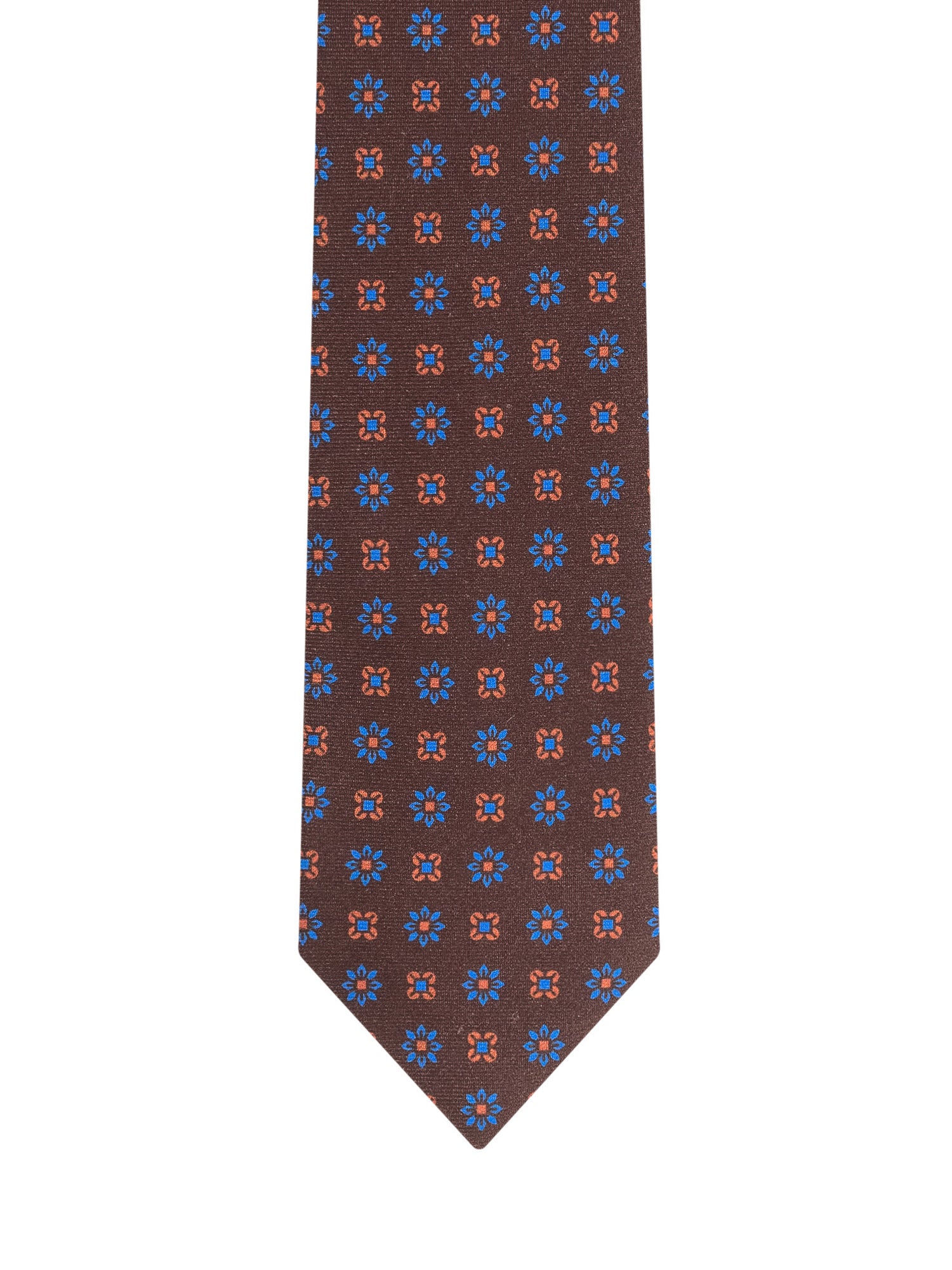 Brown Barbanapoli tie in silk with blue and red geometric micro pattern.