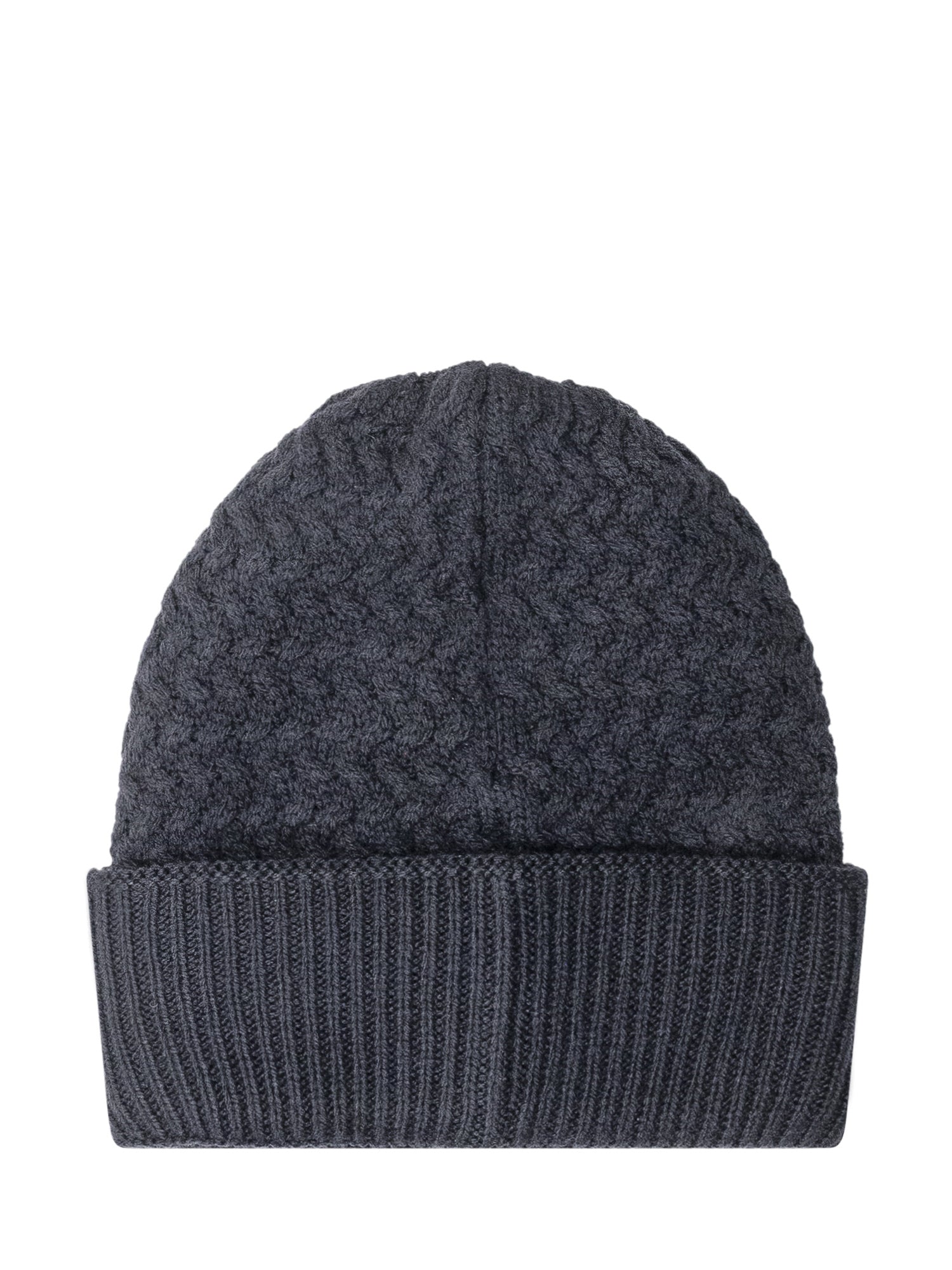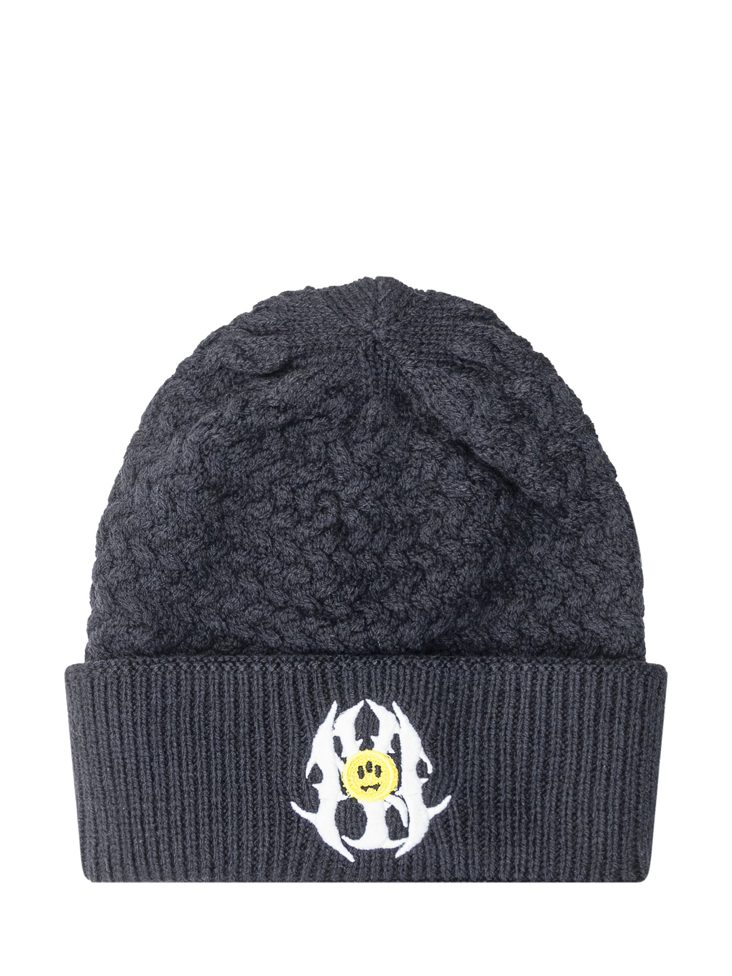 Barrow black ribbed knit beanie with fold-over brim and embroidered yellow smile logo with white graphic details.