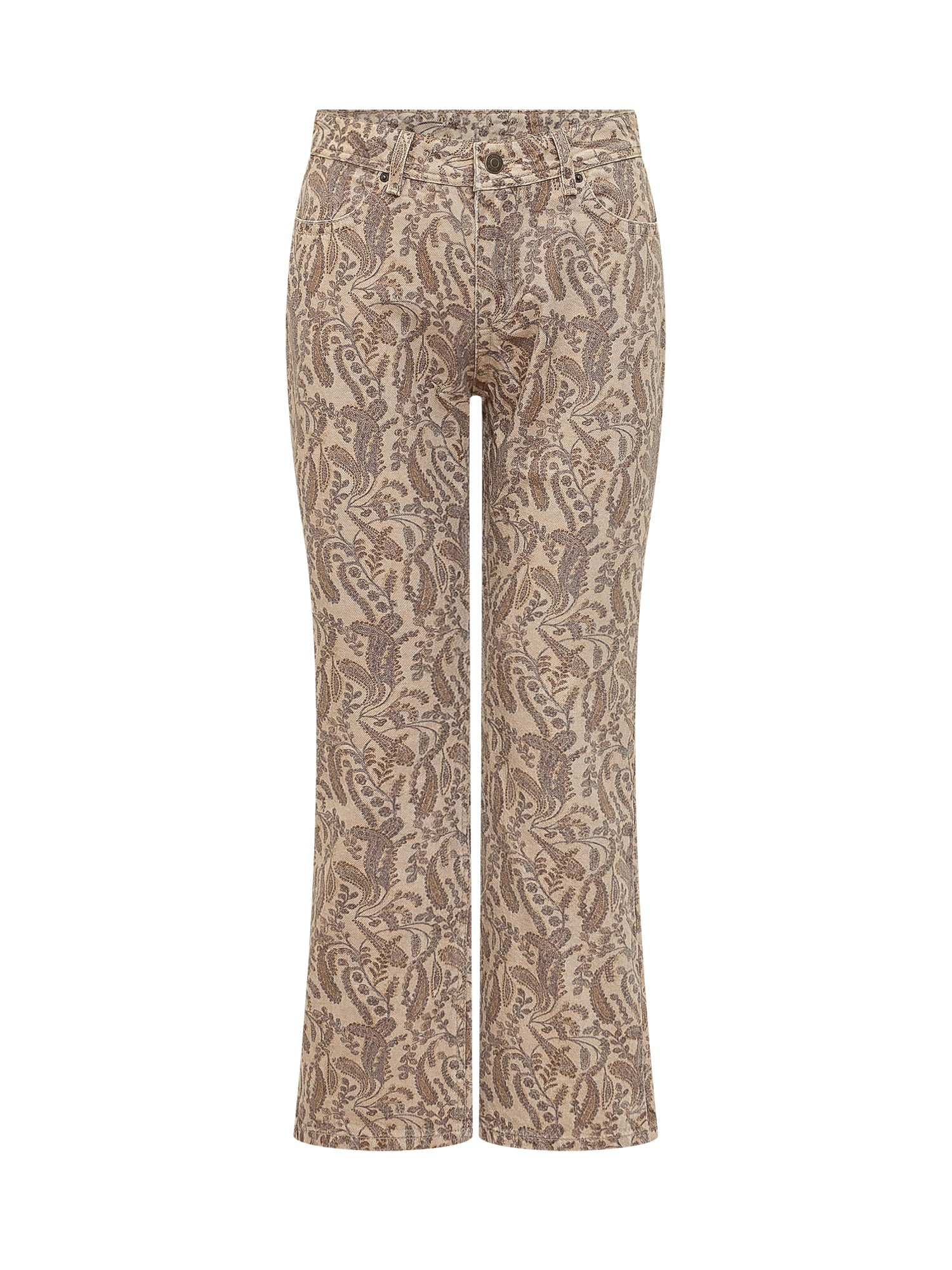 Straight leg jeans with front closure and belt loops. All-over paisley pattern and side pockets.