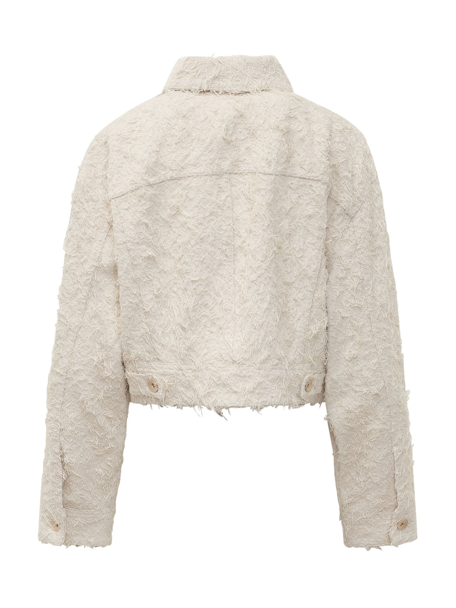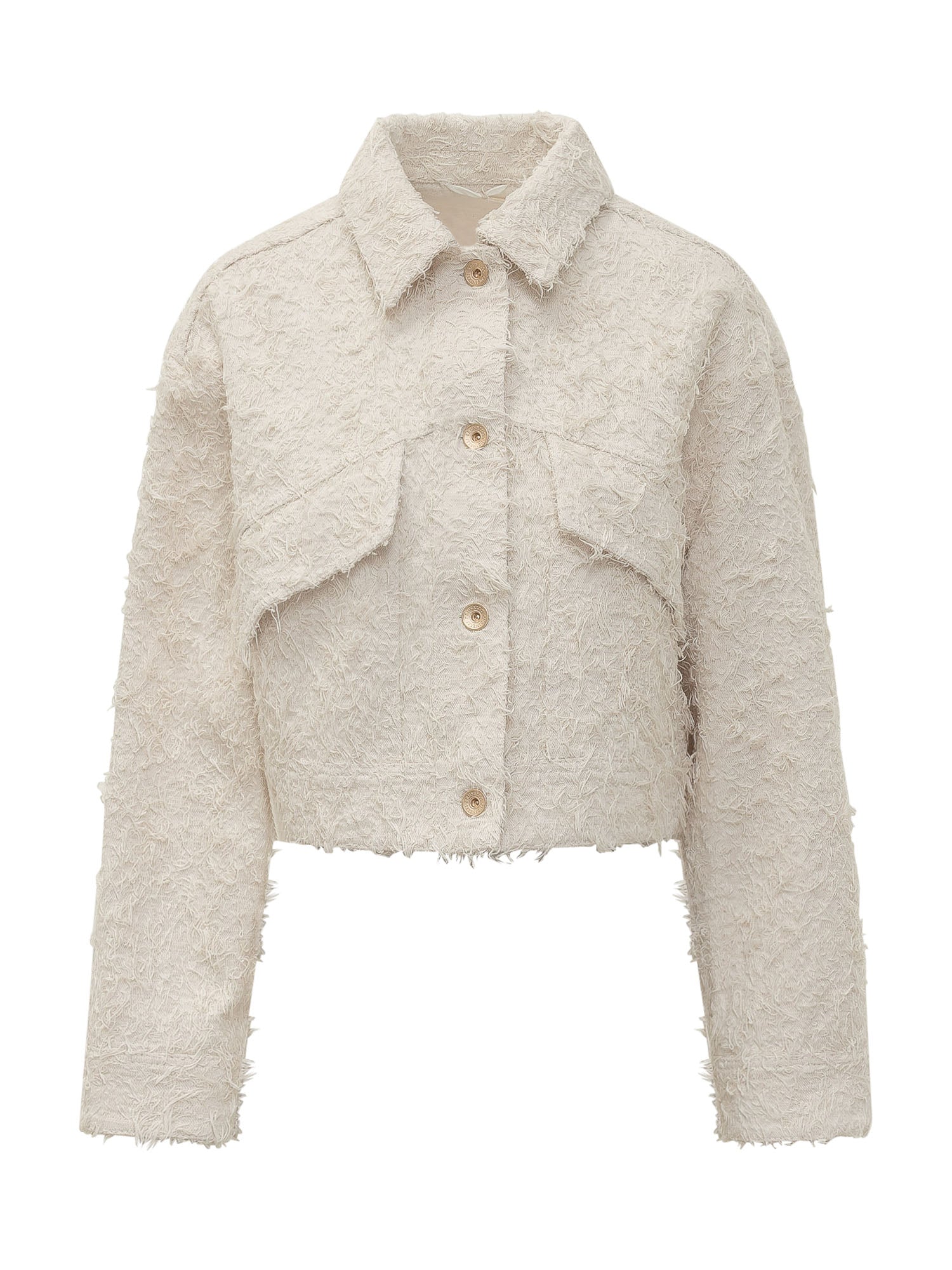 Crop jacket with classic collar and long sleeves, front button closure and flap patch pockets on the chest, surface with frayed texture.
