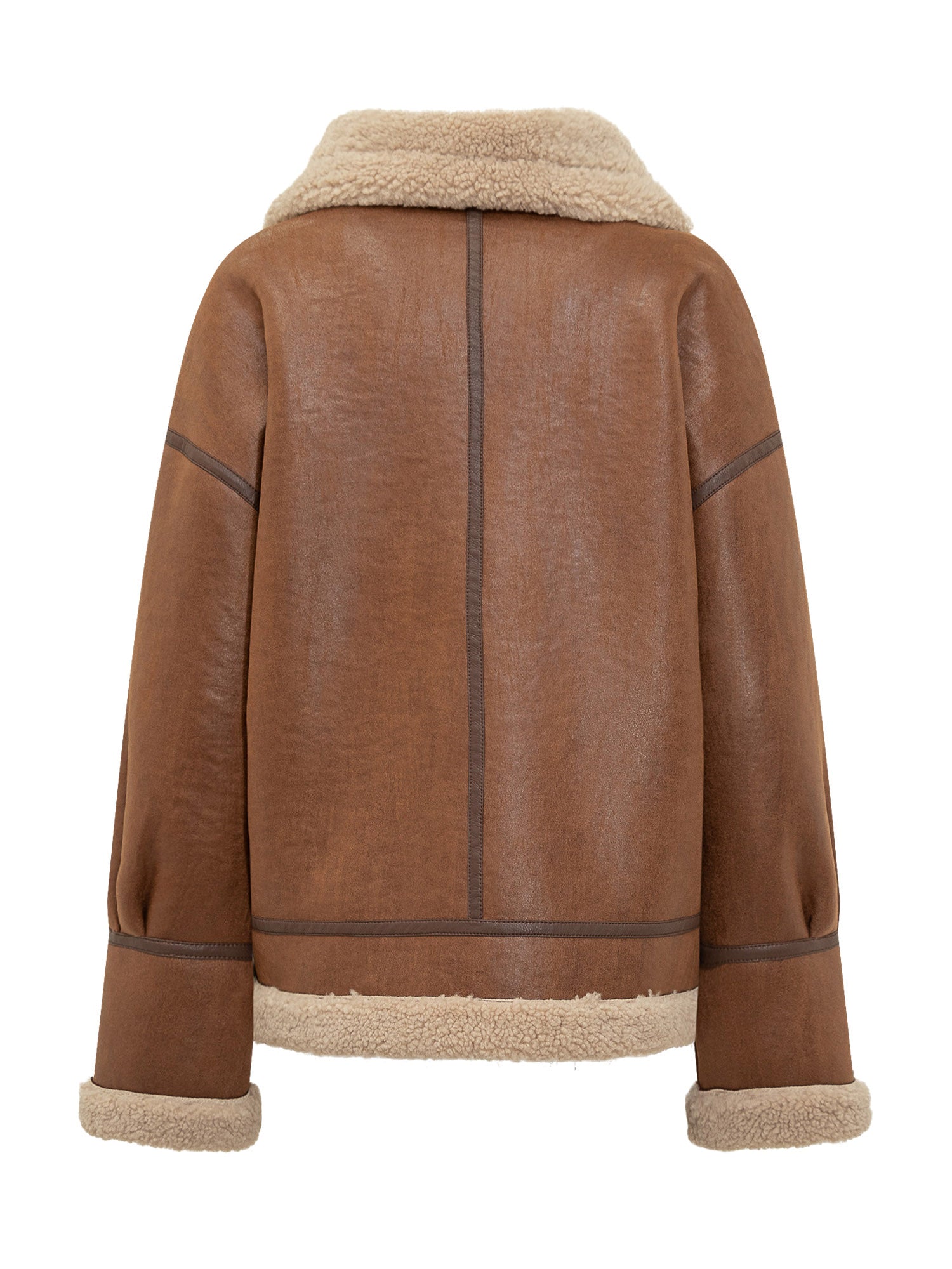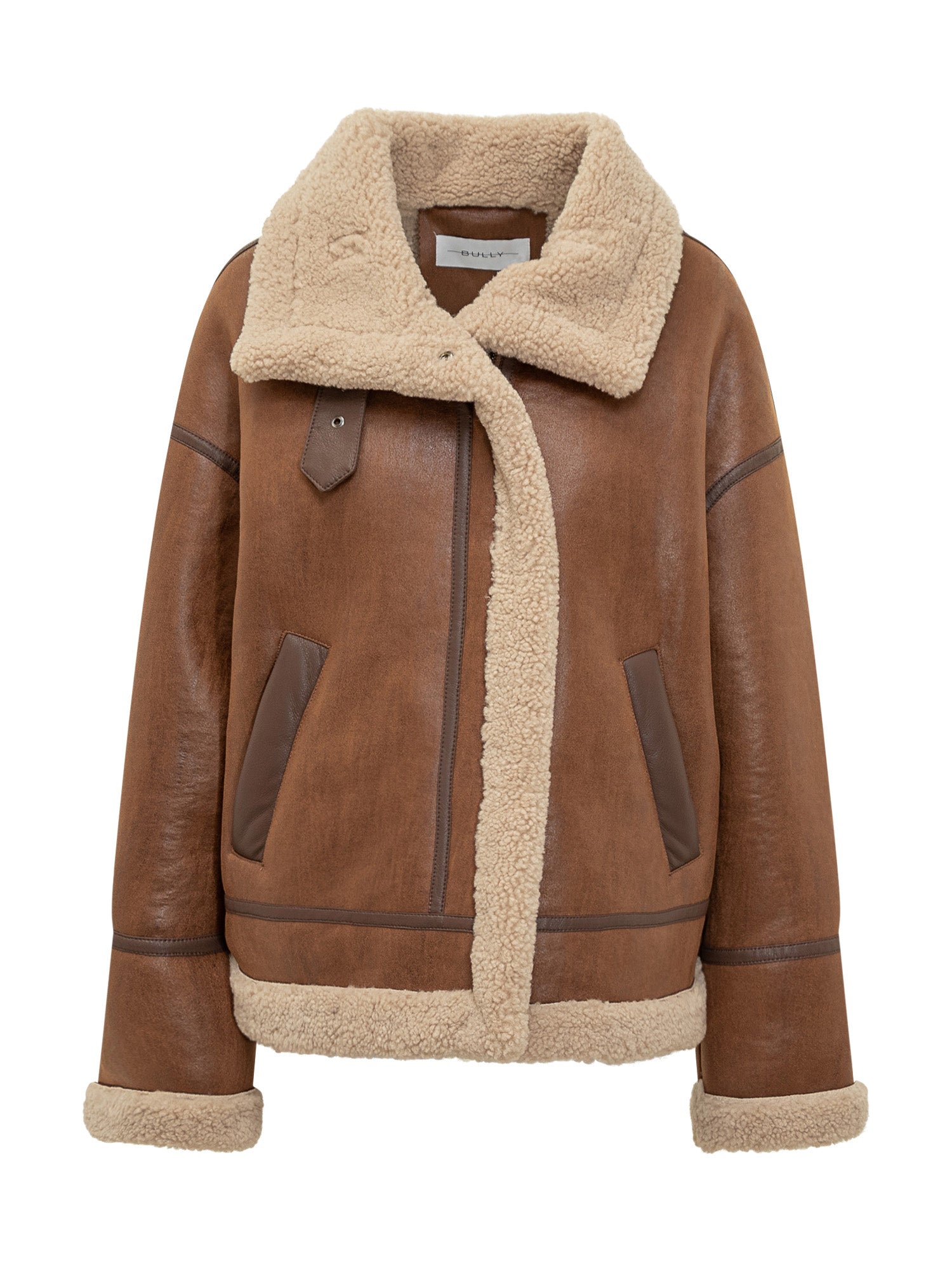 Bully brown leather aviator jacket with beige shearling lining and details.