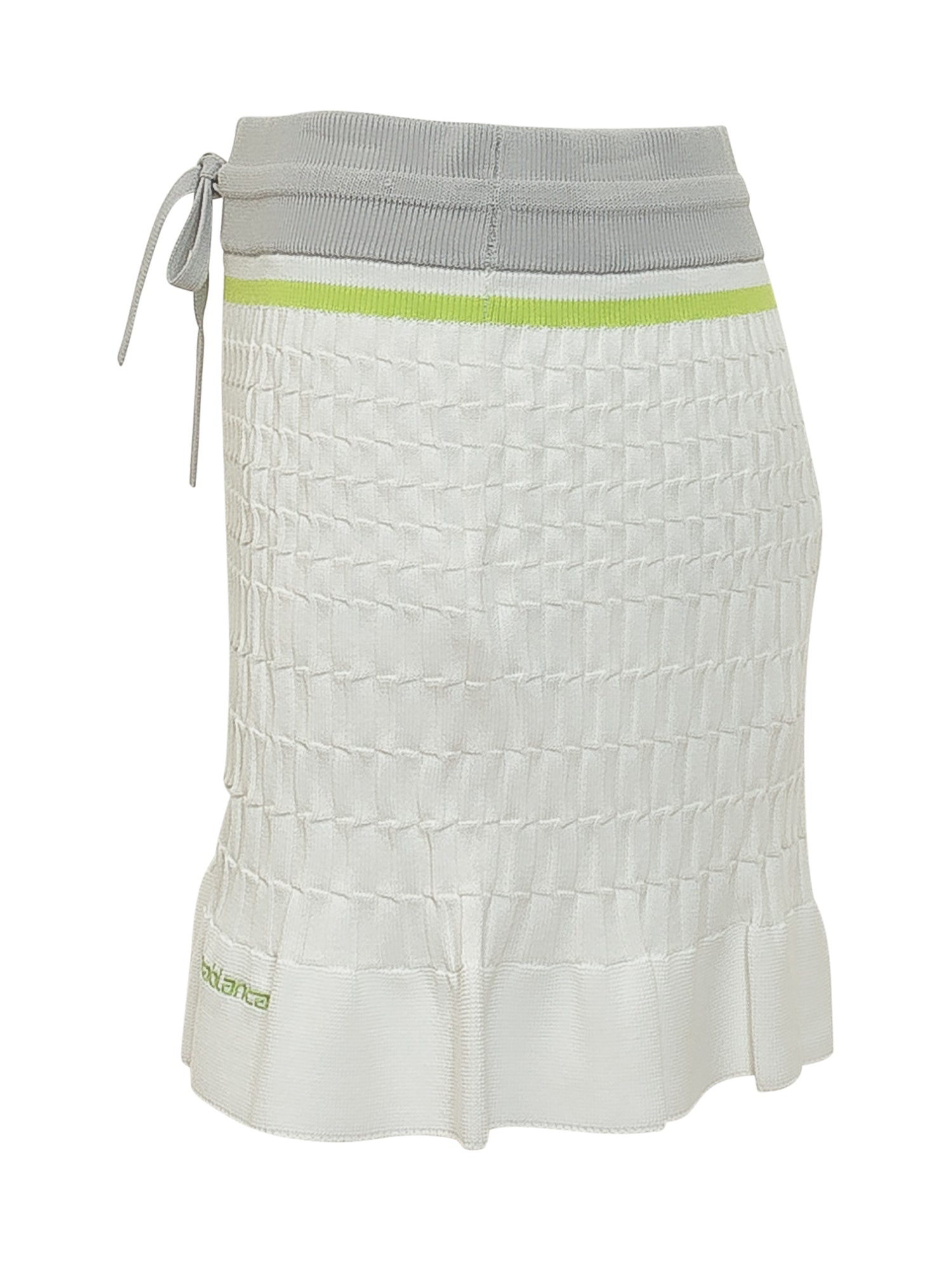Midi knitted skirt with textured stitching and flounced hem. Ribbed waistband with adjustable drawstring for a comfortable sporty fit.