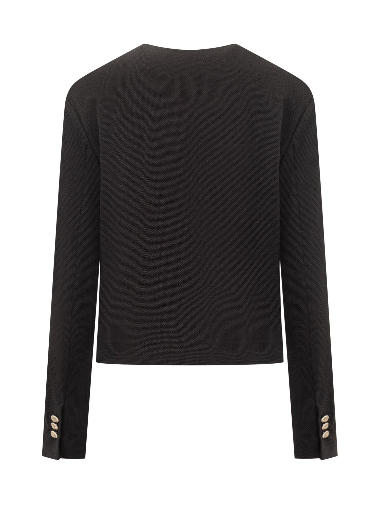Collarless. Metal button fastening. Cuffs with buttons.