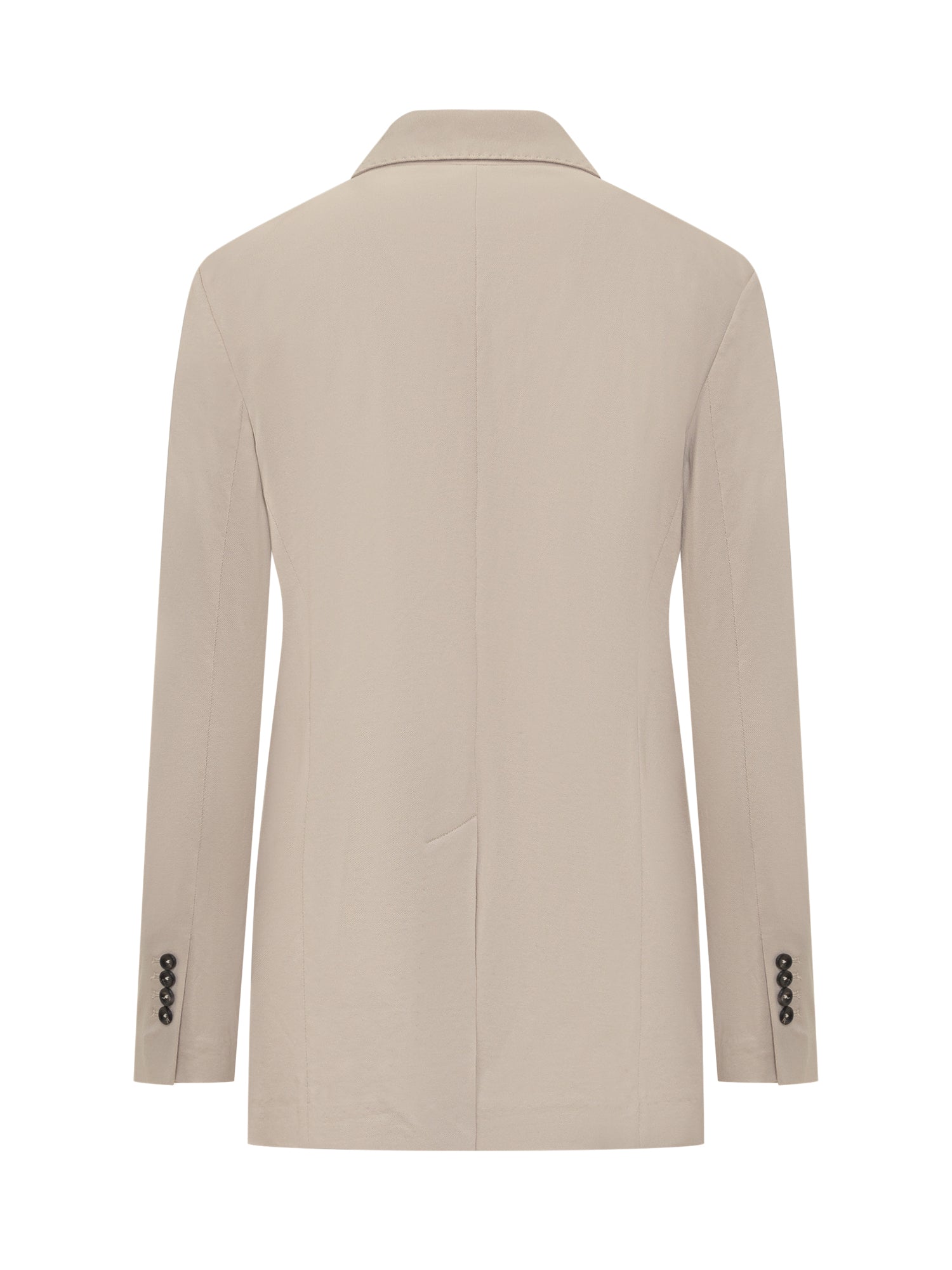 Classic lapels. Double-breasted button fastening. Cuffs with buttons. Two flap pockets and one welt pocket.