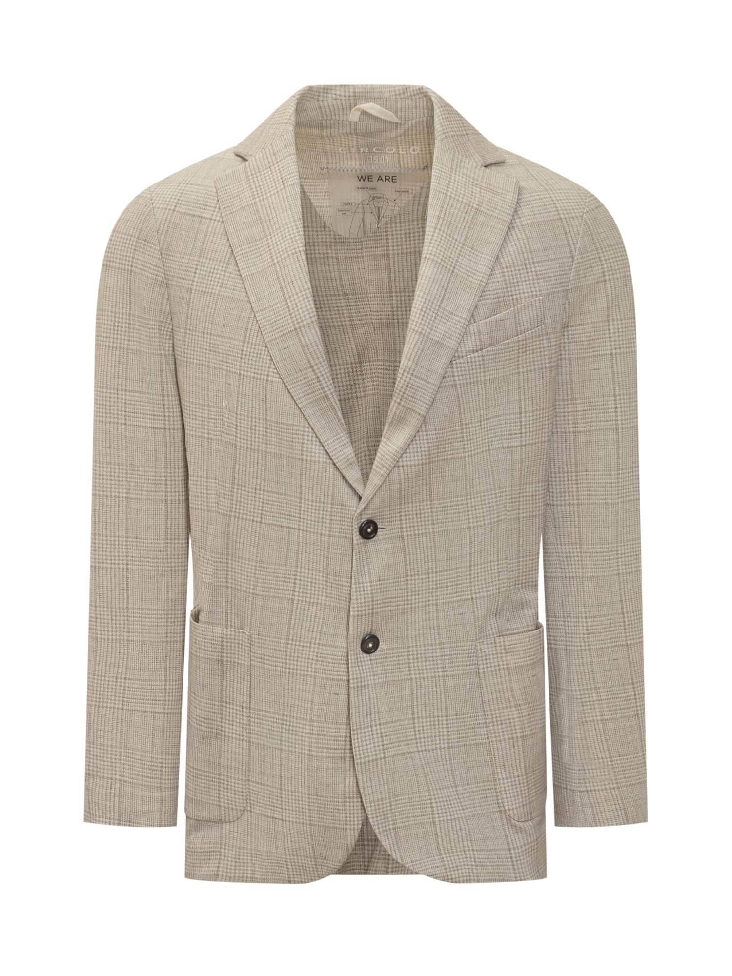 Classic lapels with buttonhole. Button fastening. Cuffs with buttons. Two patch pockets and one welt pocket.