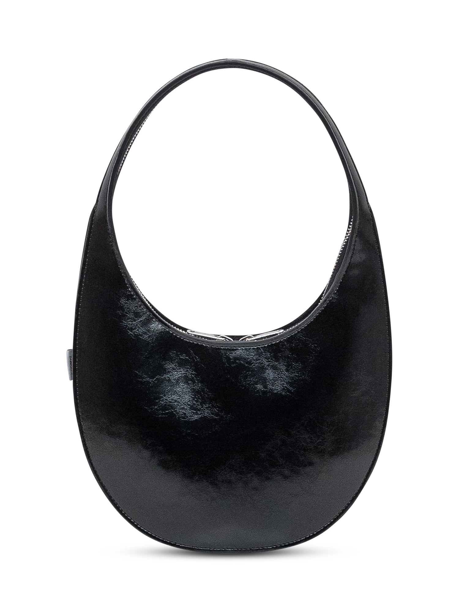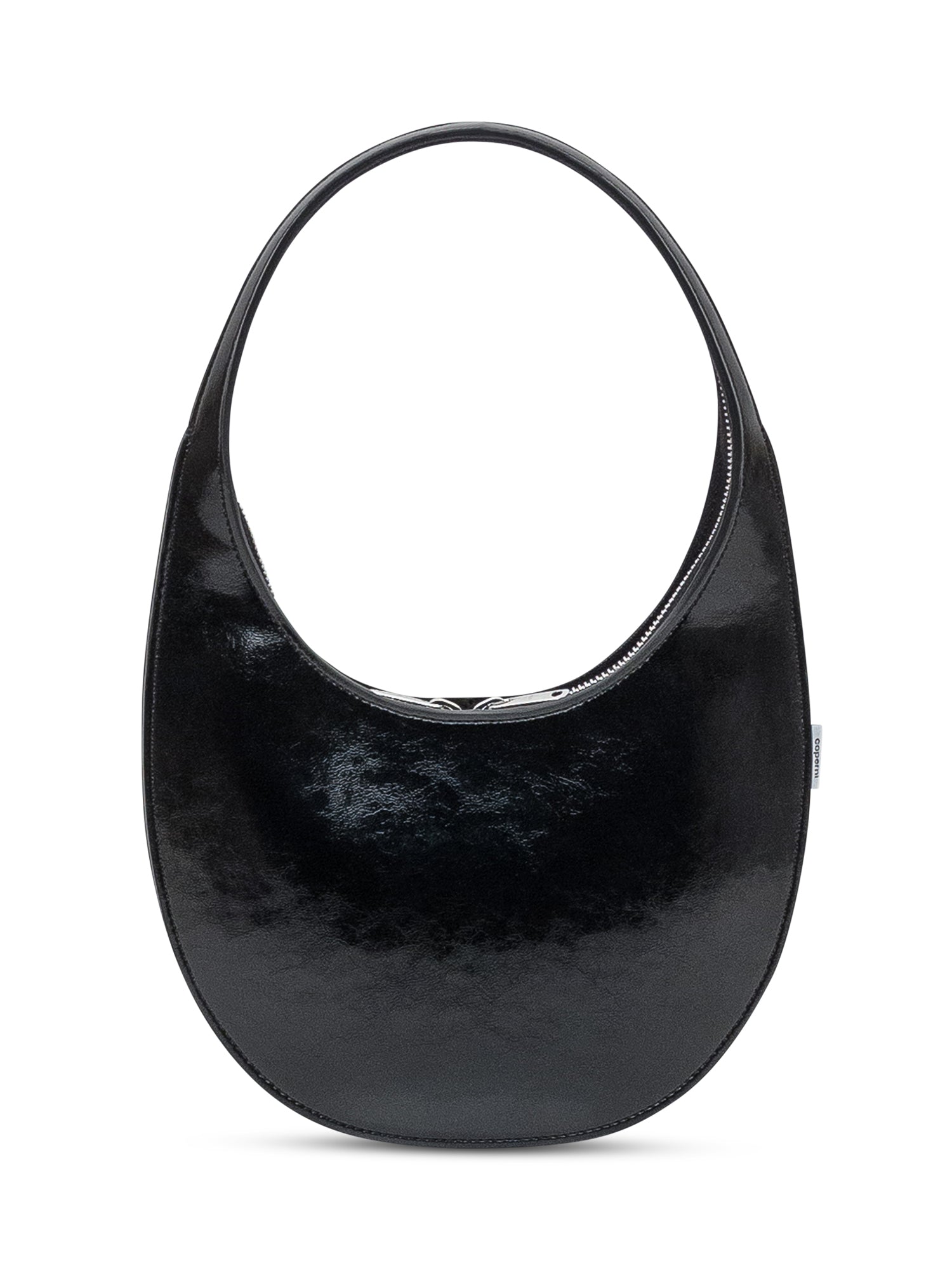 Black shoulder bag in glossy-effect leather with a crescent-shaped design.