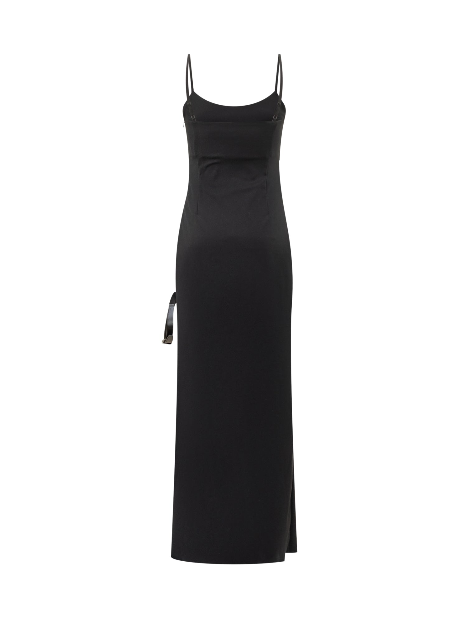 Coperni long black dress, minimal and sophisticated, featuring thin straps and a straight silhouette. Side strap detail adds a modern and sensual touch