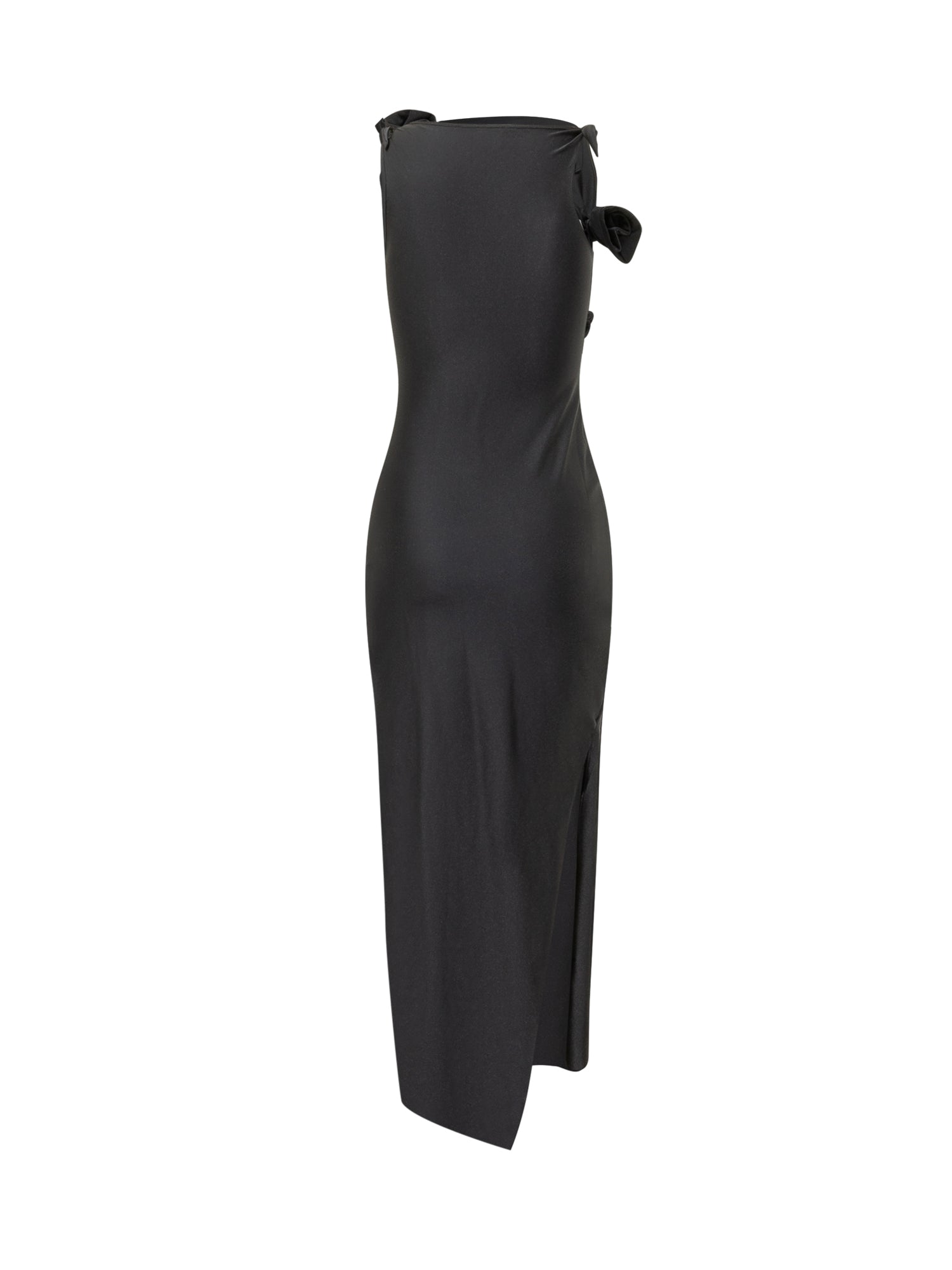 Elegant long gown with a body-skimming fit and floral appliqué details at the bodice. Asymmetric line and round neckline.