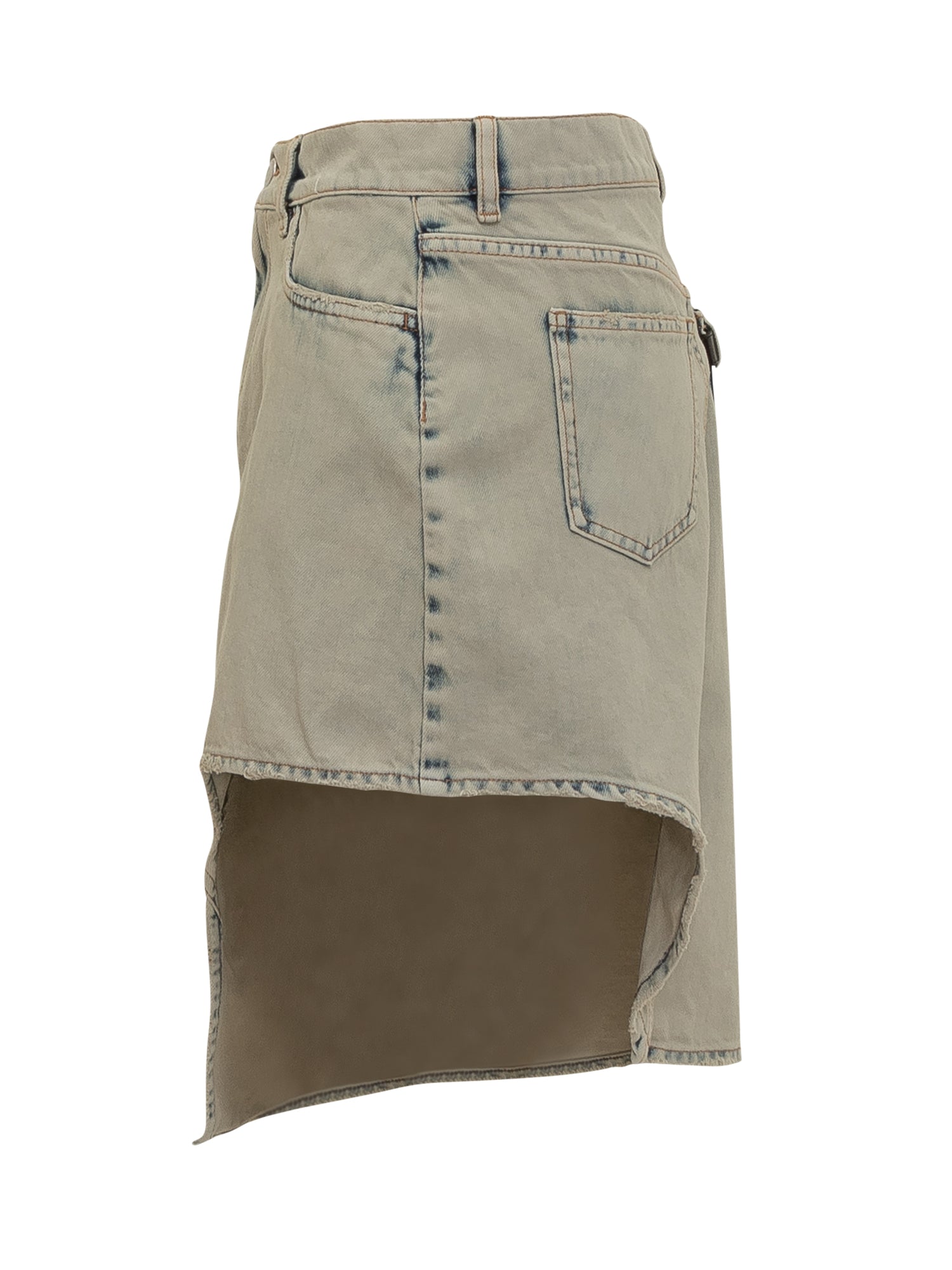Short skirt in denim. Belt loops. Five pockets. Buckle with logo on the back. Asymmetrical bottom. Zip and button closure.