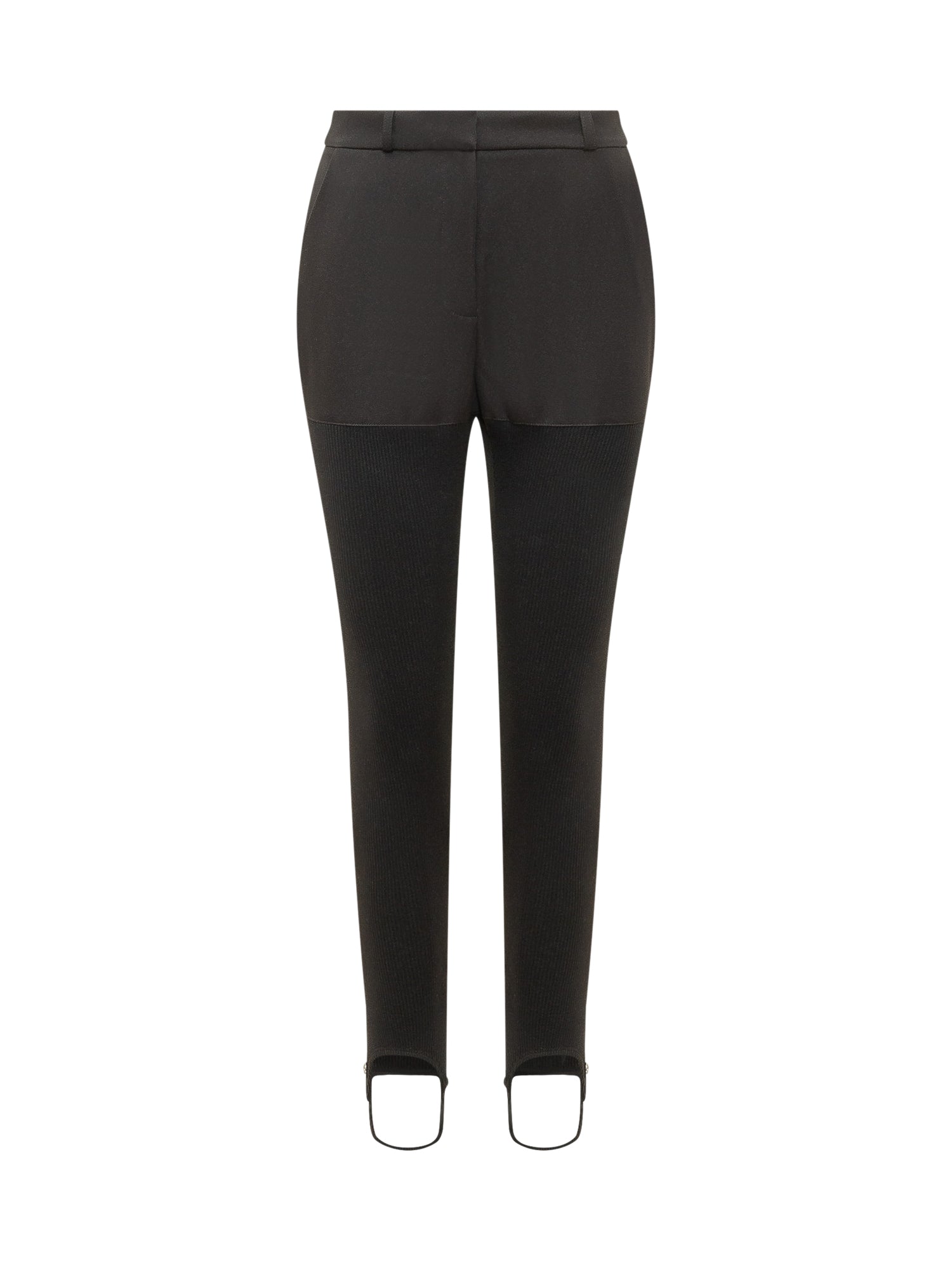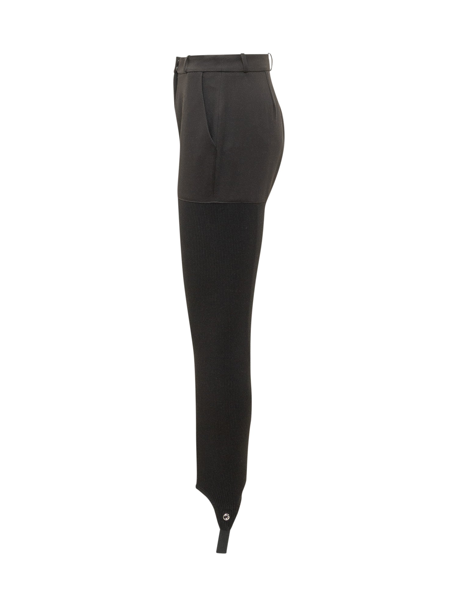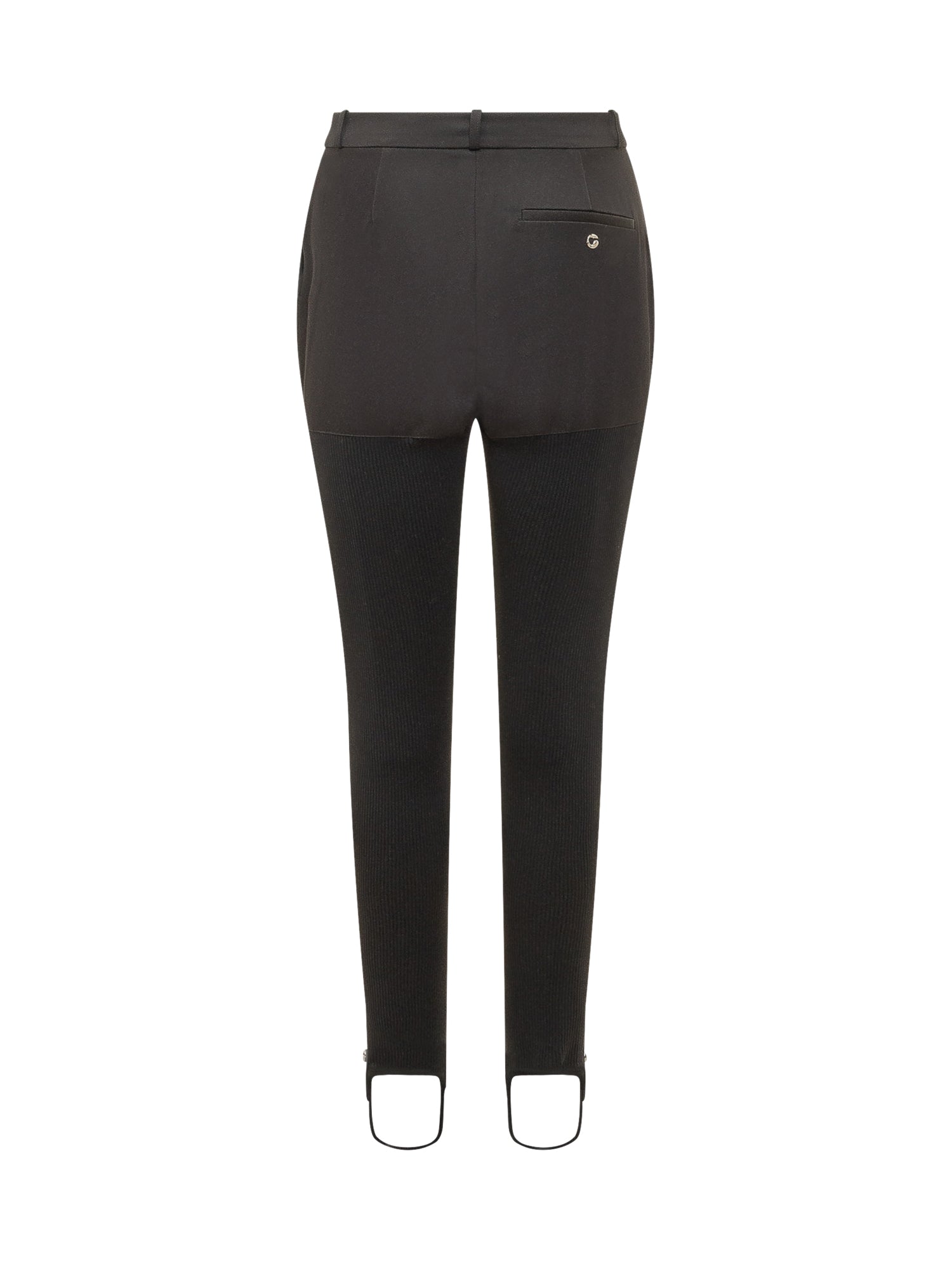 Slim-fit pants with a structured upper and stretch inserts along the leg. High-waisted design with stirrup hems, crafted to enhance the silhouette while ensuring a sleek and refined fit.