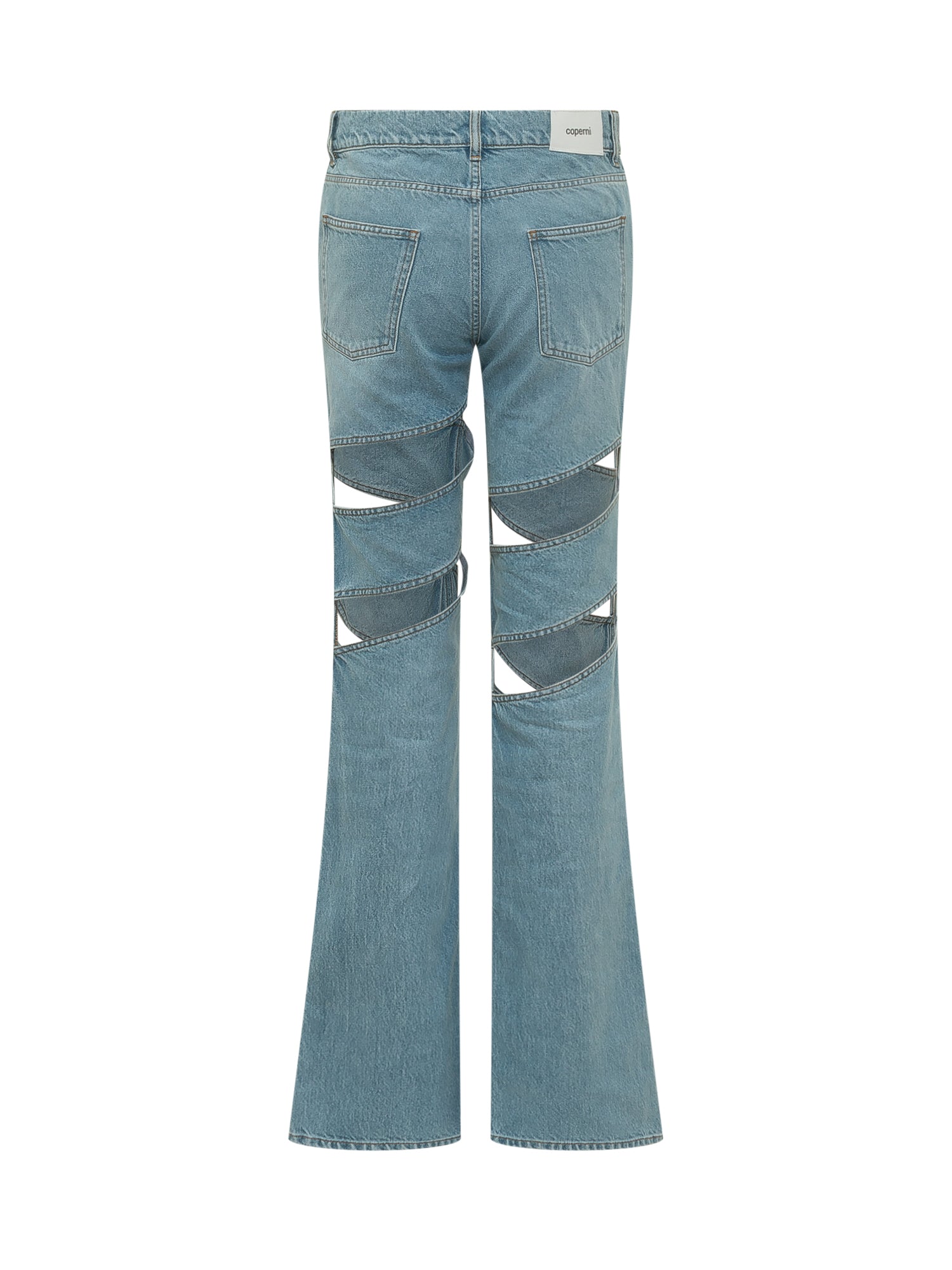 Five pocket jeans with button closure. Diagonal cut panels along the leg and flared hem, distinctive and contemporary design.