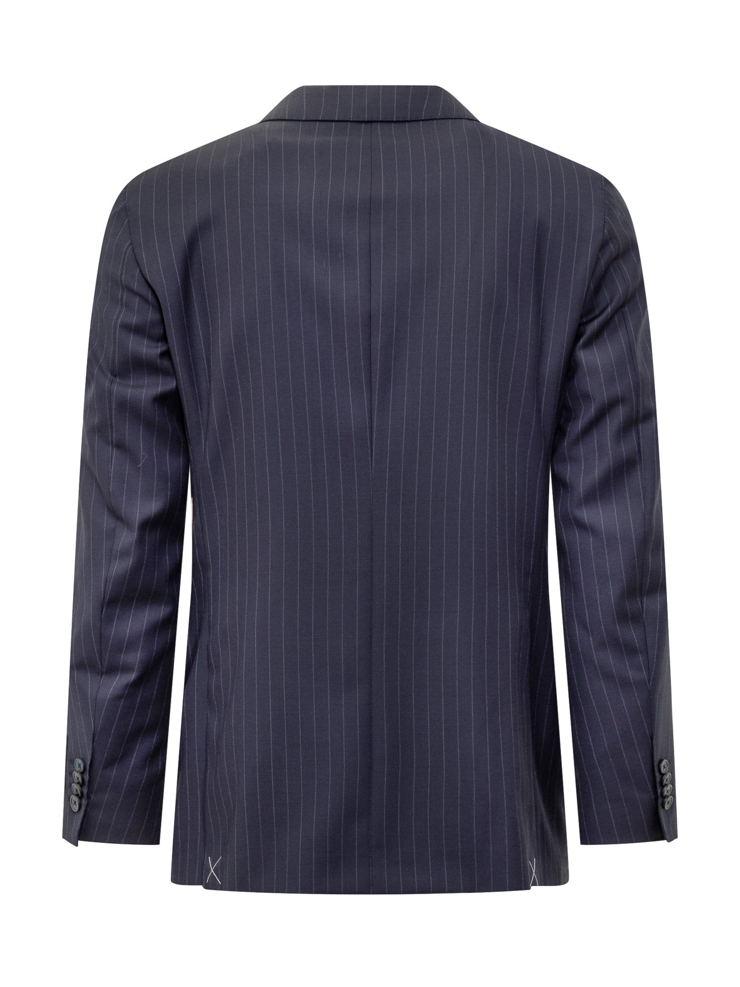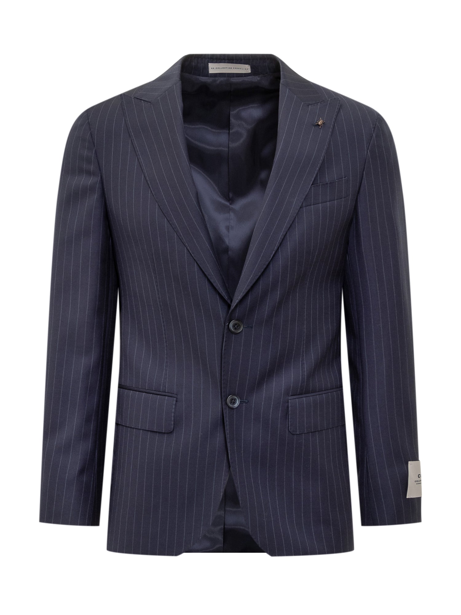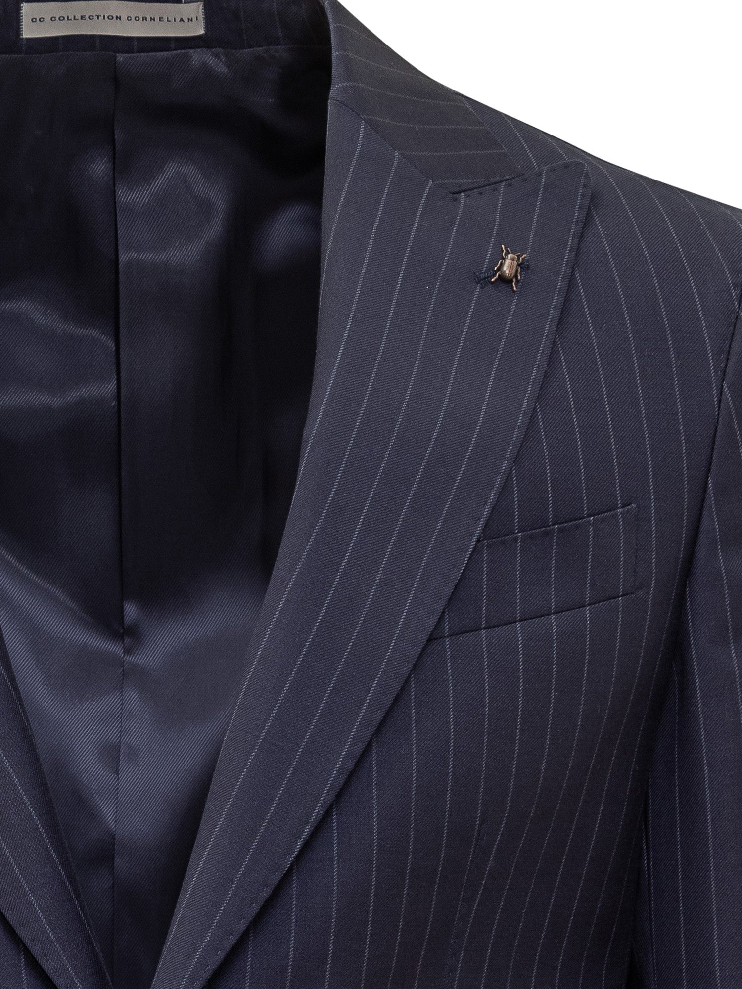 Corneliani blue wool suit with pinstripe pattern. Two-button jacket with classic lapels and matching trousers.