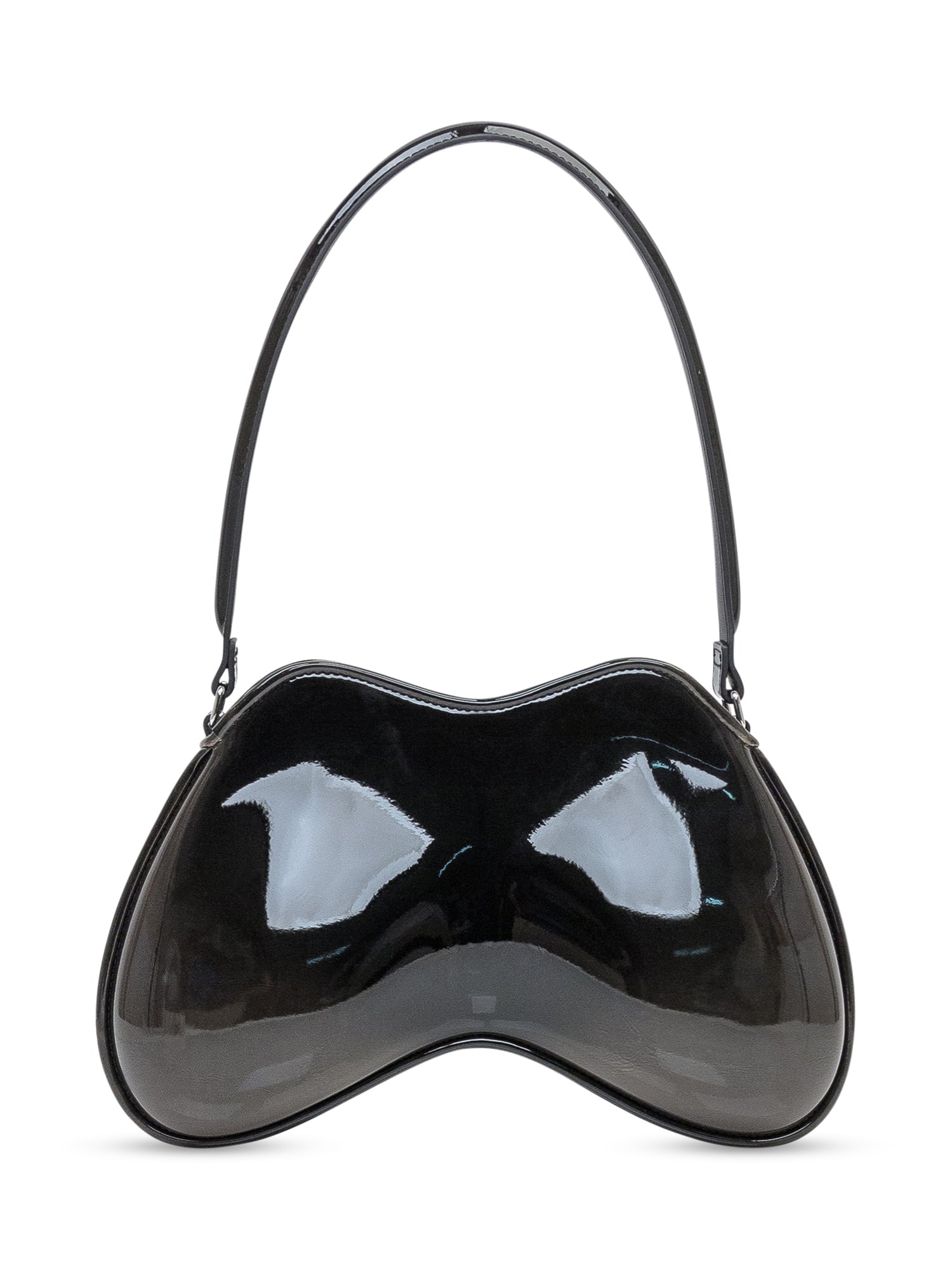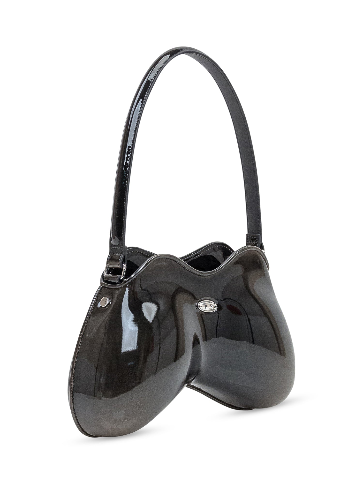 Diesel Double-D shoulder bag in black patent leather with sculptural silhouette. Features single handle, front metal logo and zip closure.