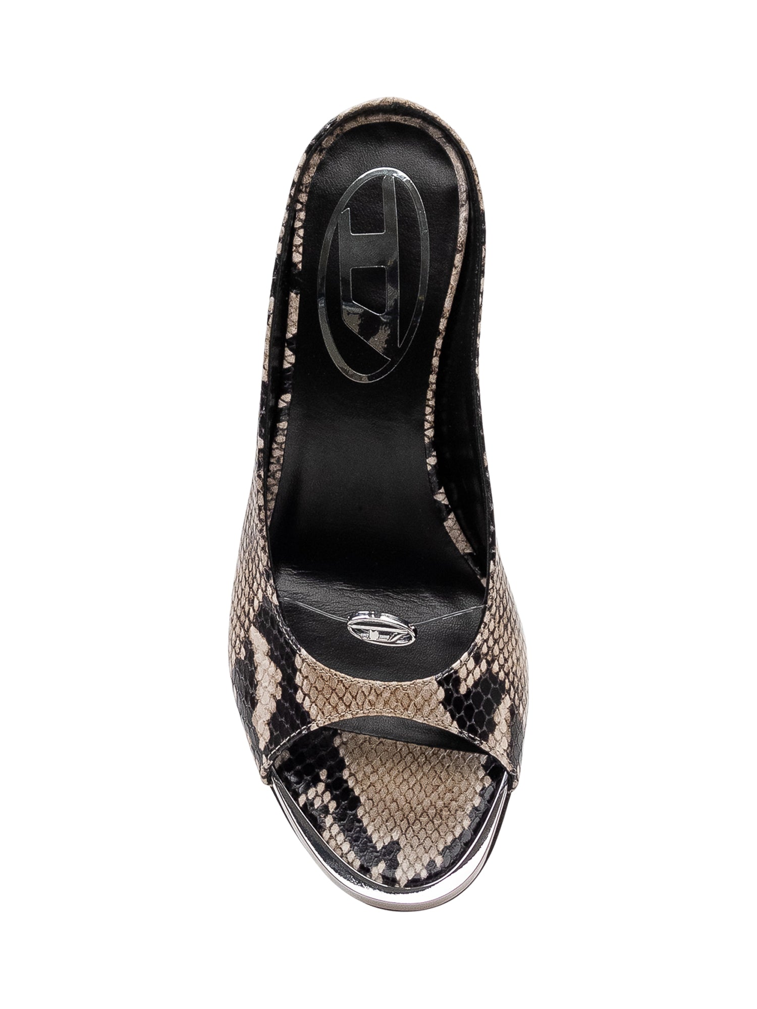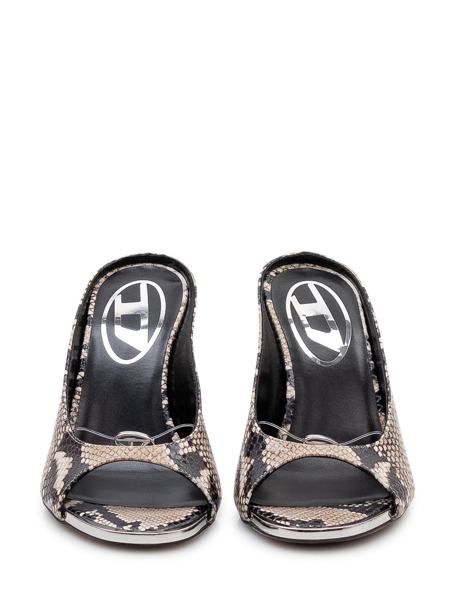 Mule sandals with open toe, slim high heel and sleek silhouette. Elegant shaped upper.