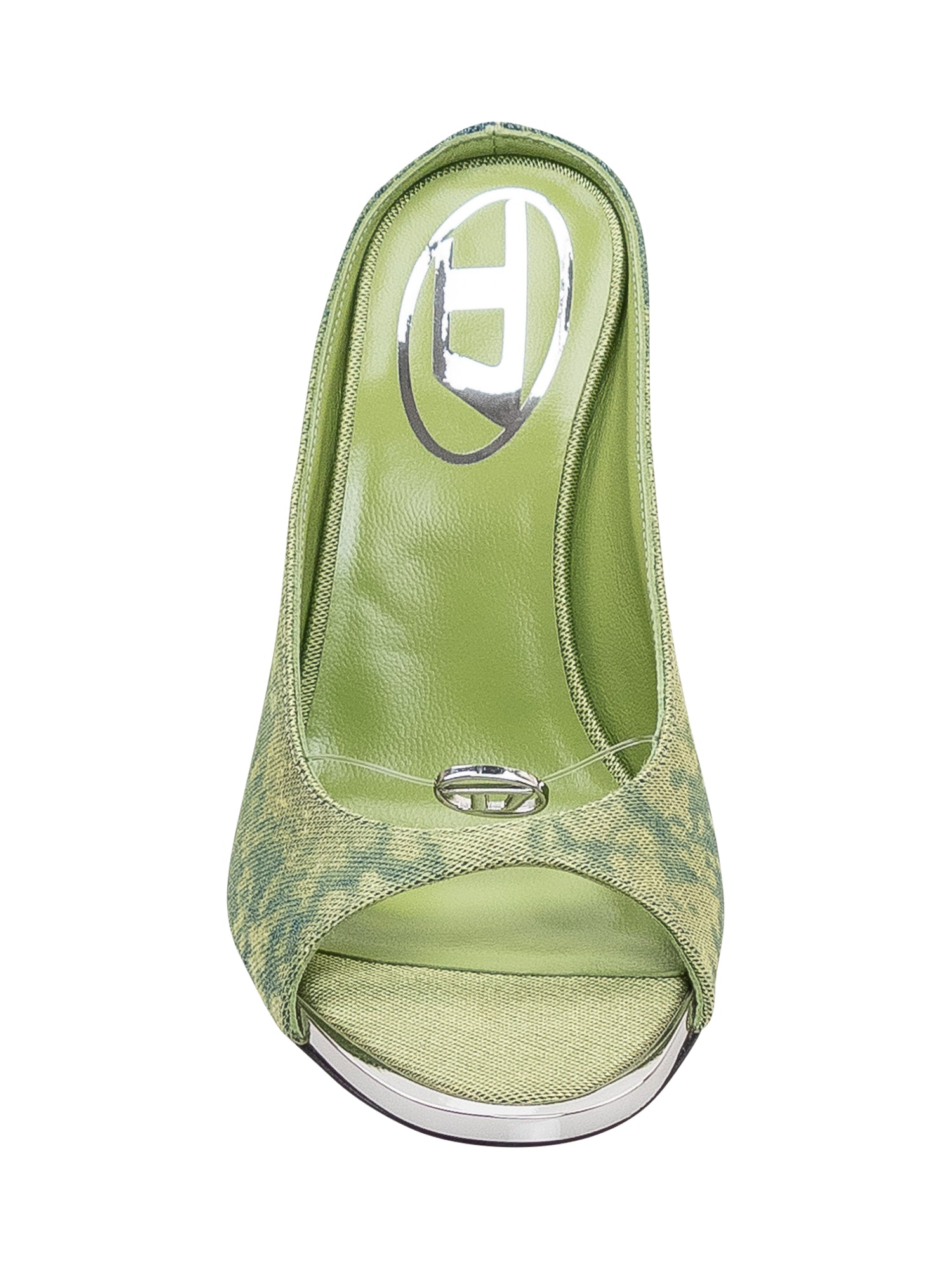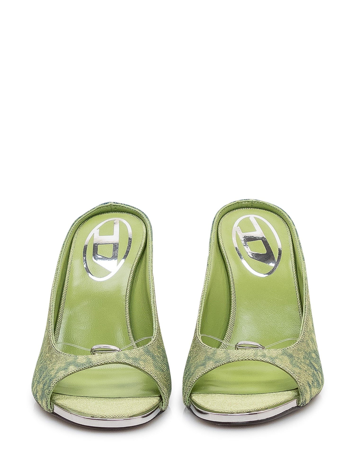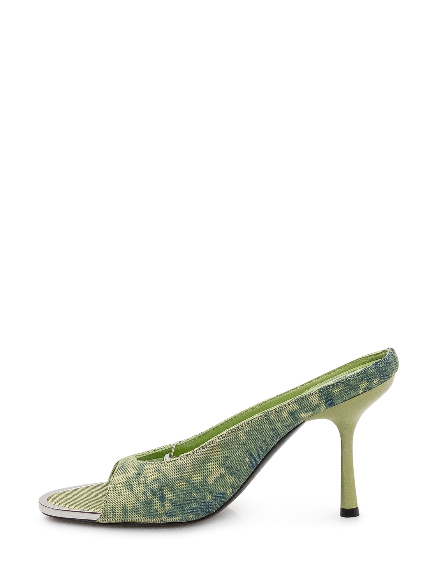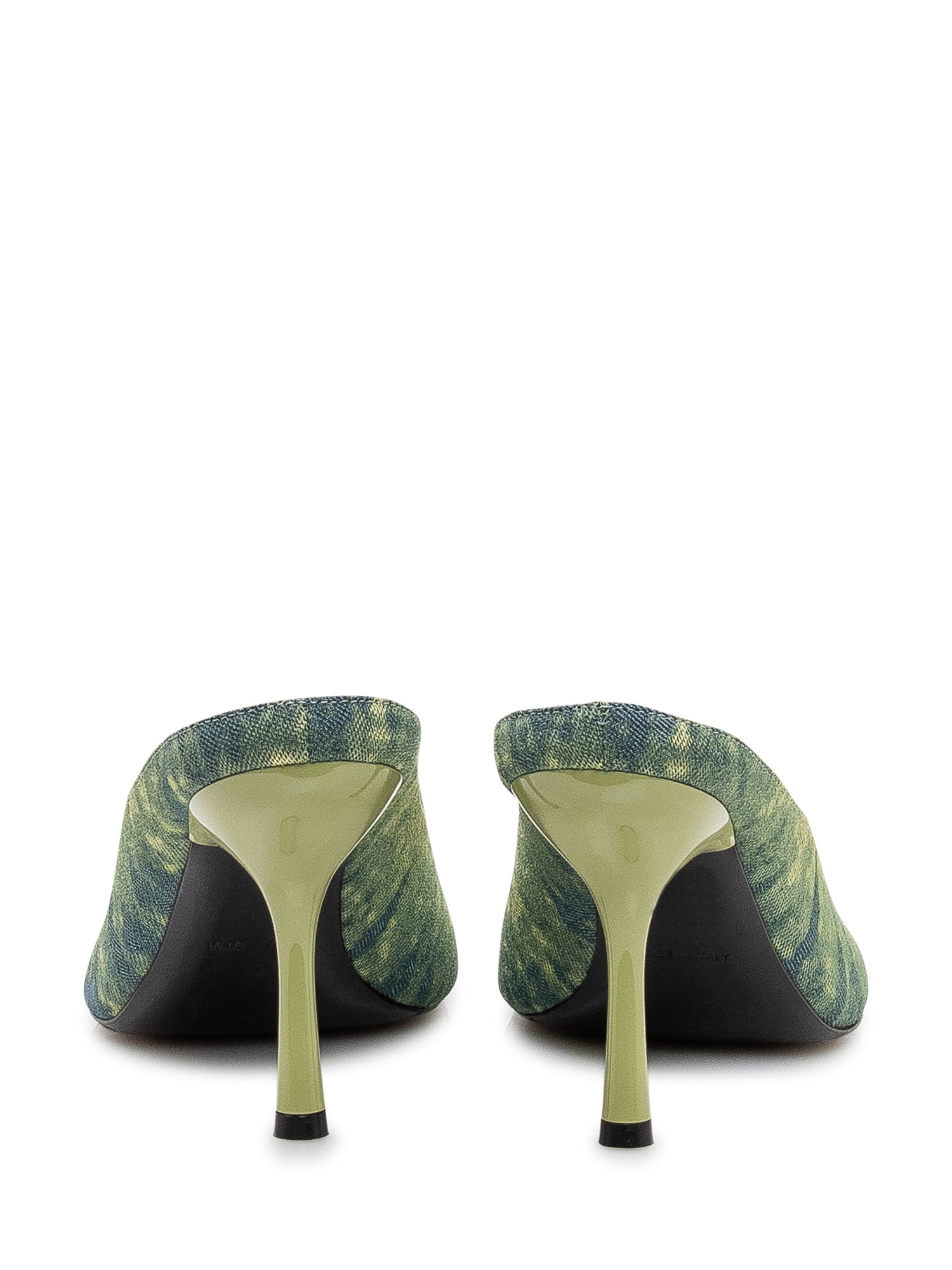 Mules with open toe and slim high heel, streamlined silhouette and gradient patterned surface.