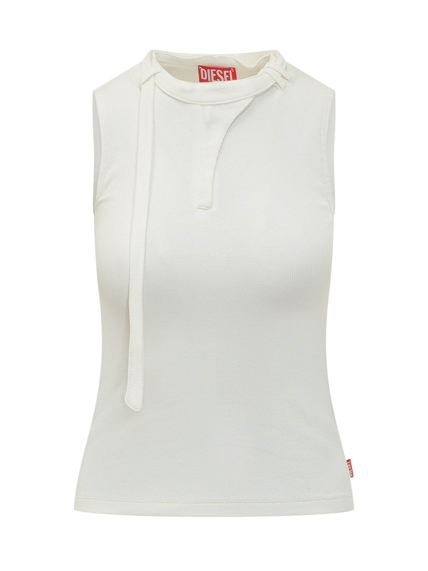 Sleeveless ribbed top with asymmetric neckline detail. Slim fit.