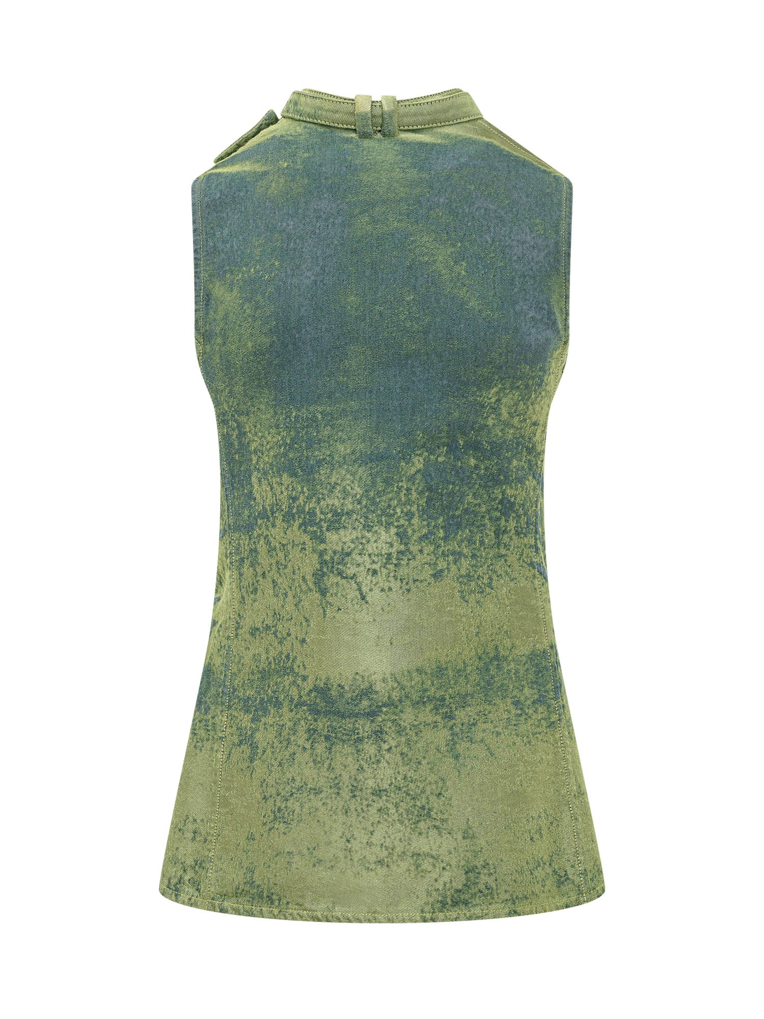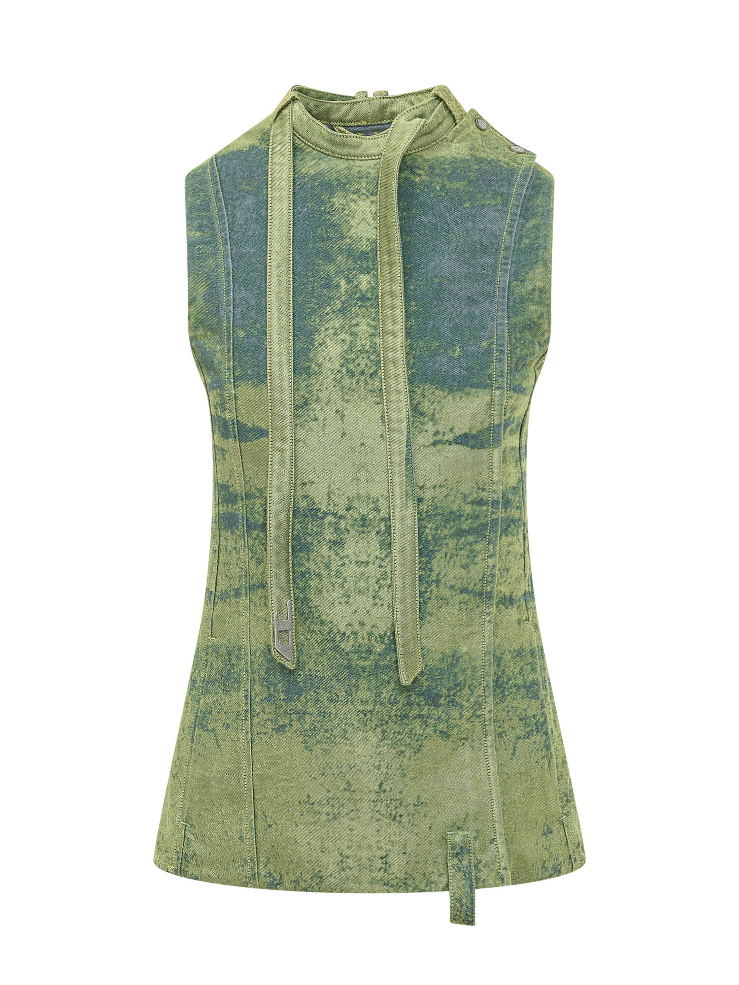 Sleeveless top with high neck and long front ties. Shaped line with visible vertical seams and applied metal detail. Structured design that enhances the figure with a contemporary touch.