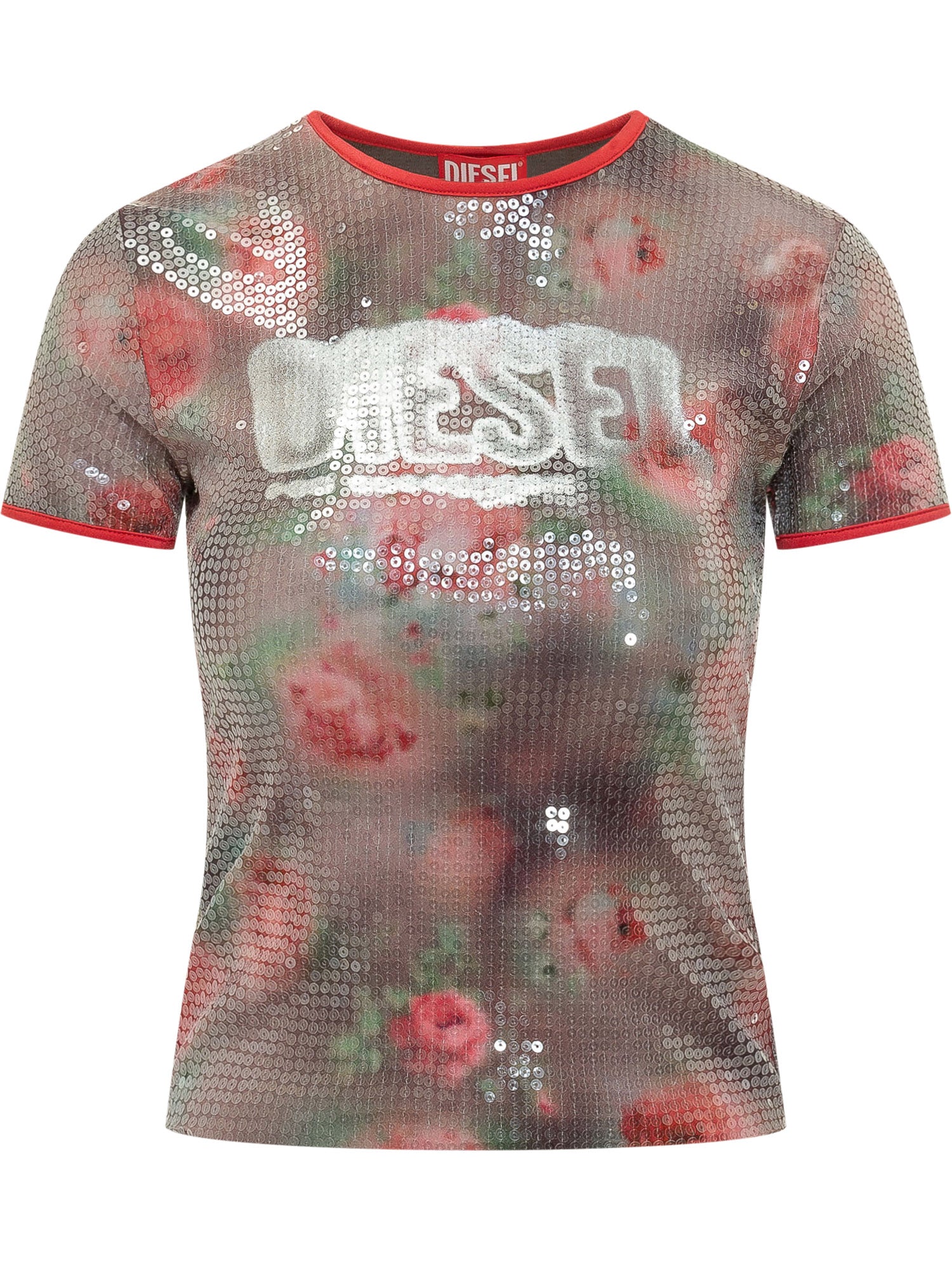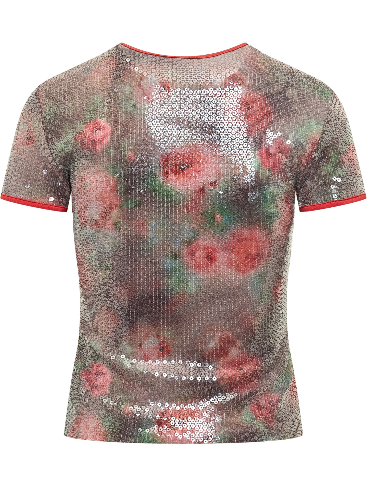 Short-sleeve T-shirt with sequin-effect applications and all-over print. Fitted line.