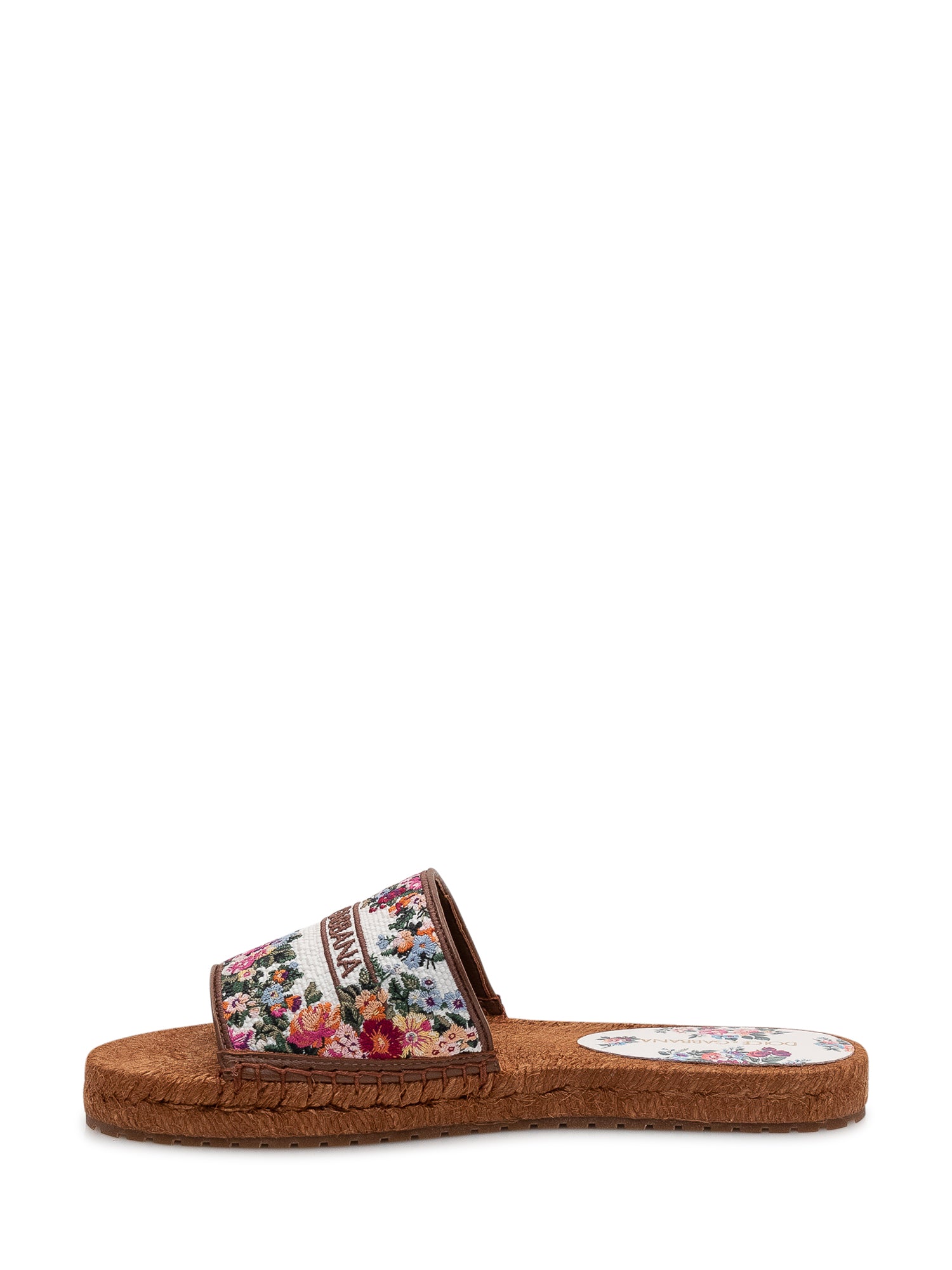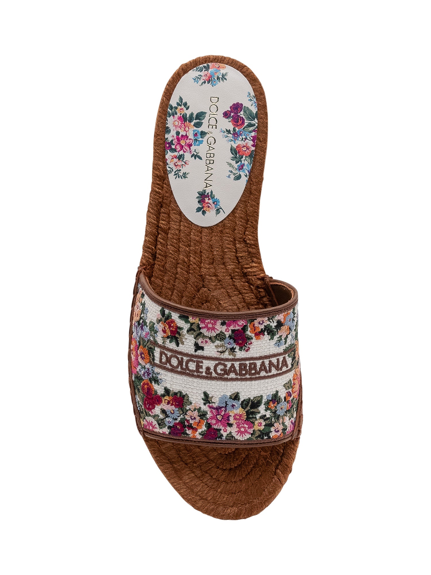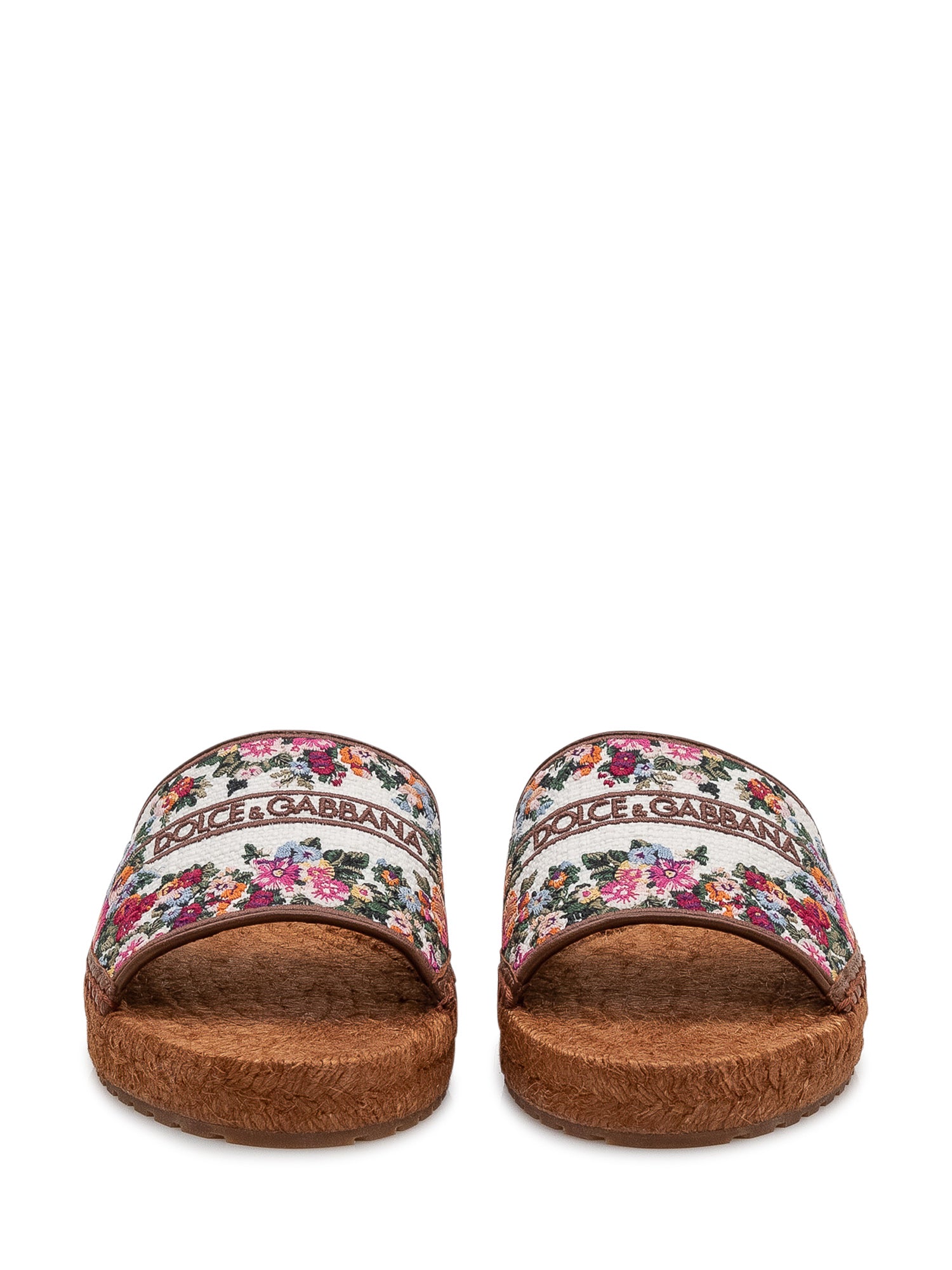 Espadrilla slide sandal with floral print and visible logo on the upper, open toe design and espadrille style sole. Perfect to enhance summer outfits with a refined touch.