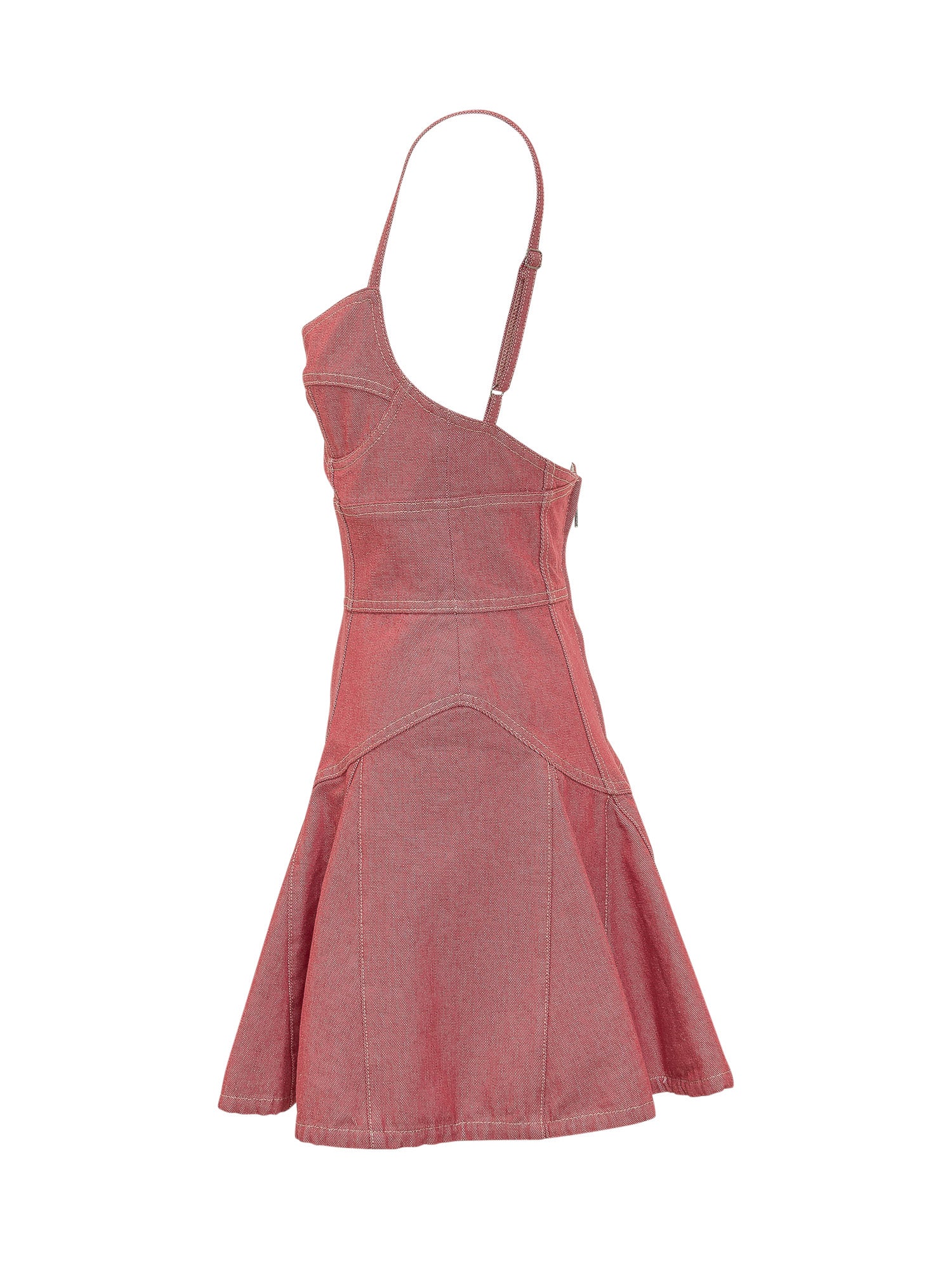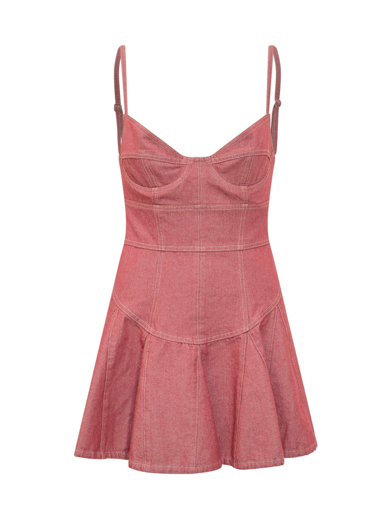Short dress with structured bodice and adjustable thin straps. The flared skirt enhances the silhouette for a feminine.