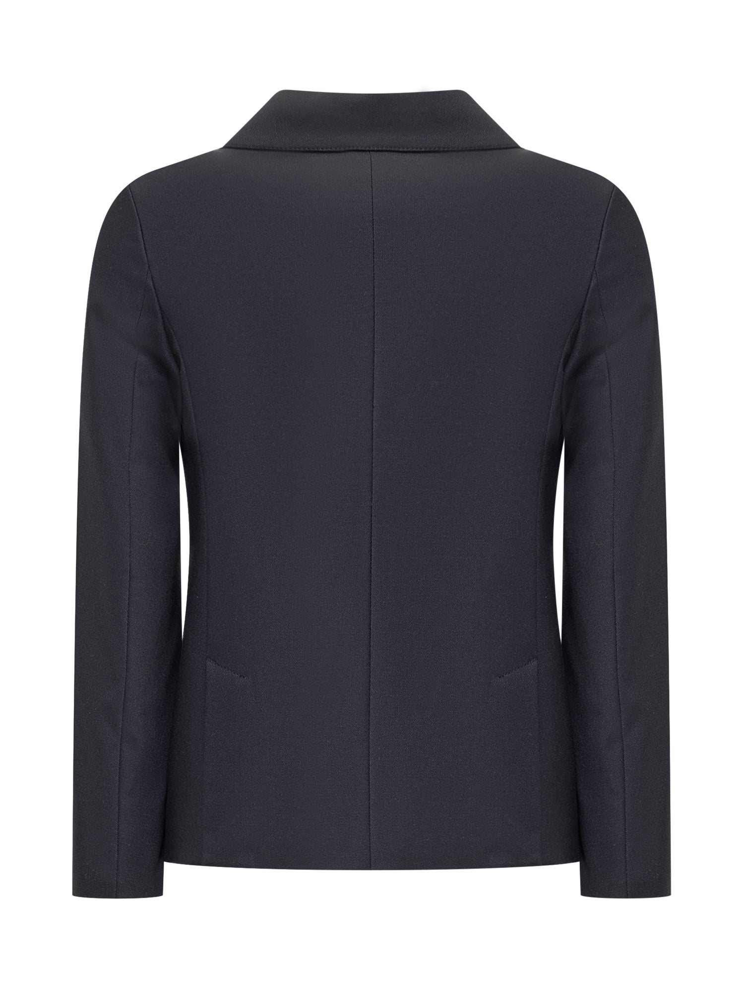 Blue blazer jacket. Button fastening. Reverse collar. Patch pockets. Chest pocket.