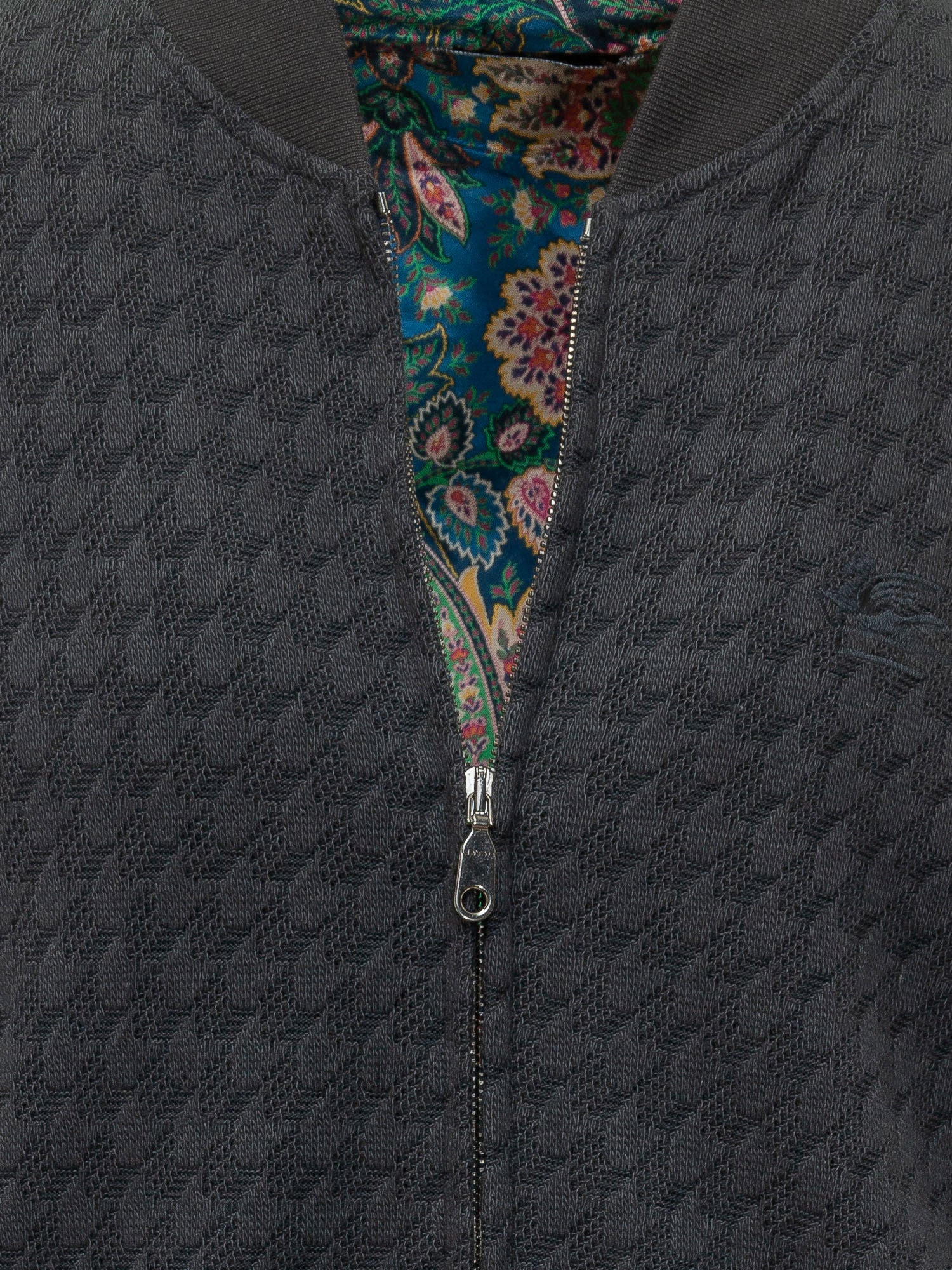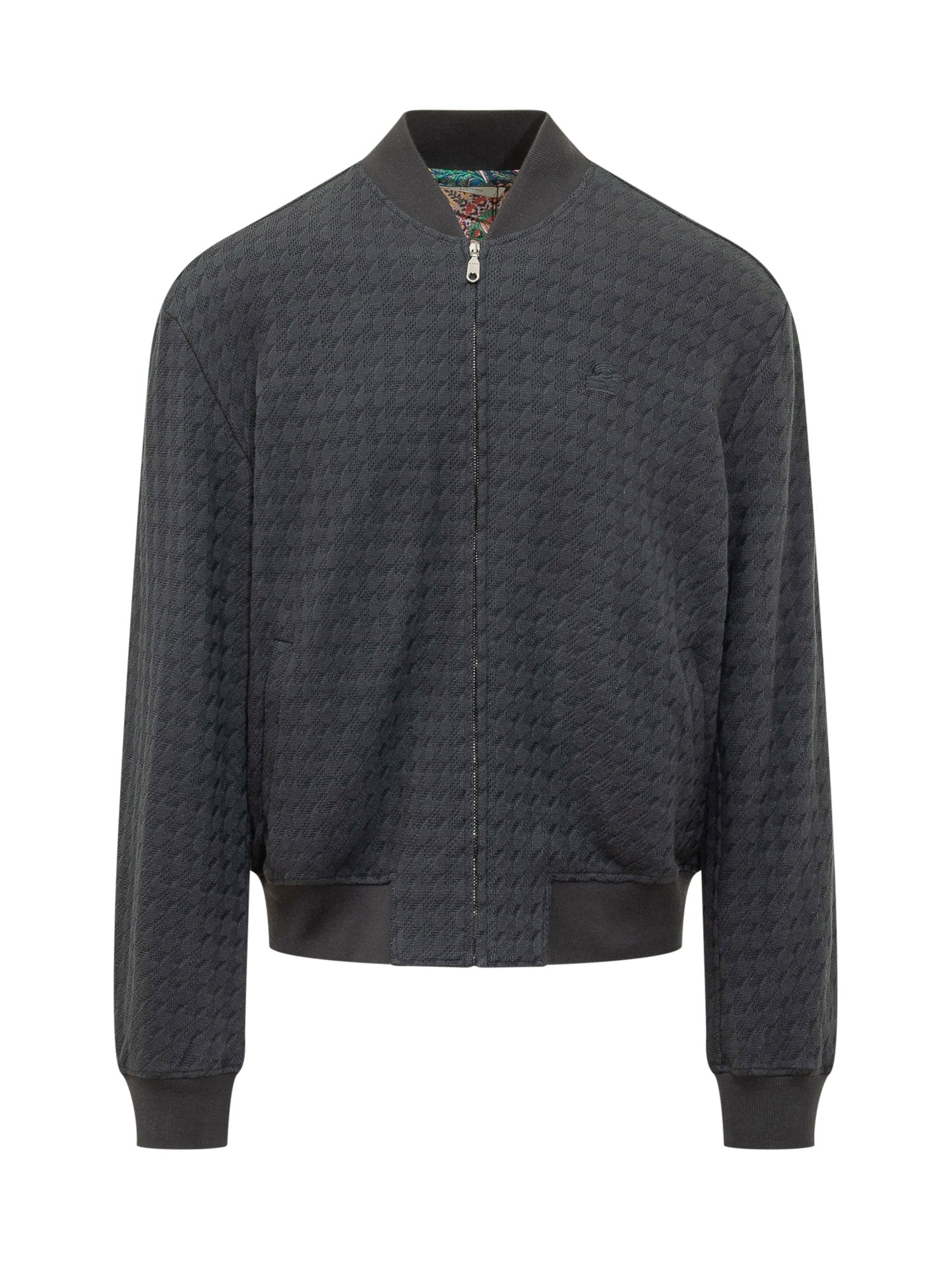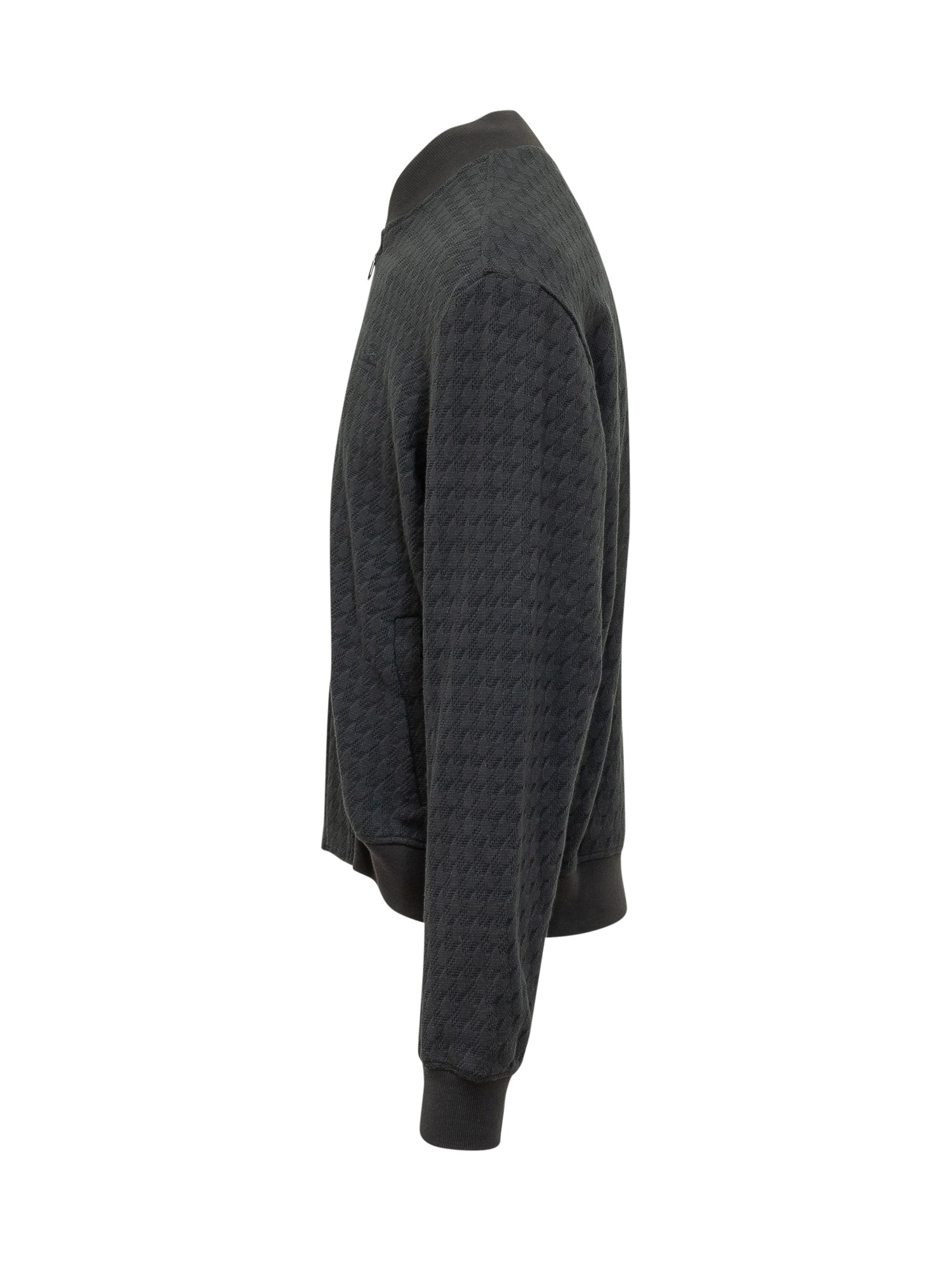 Bomber jacket with front zip closure and high neck, long sleeves with elasticated cuffs and hem, textured pattern all over and tonal logo on the chest, cropped design with side pockets.