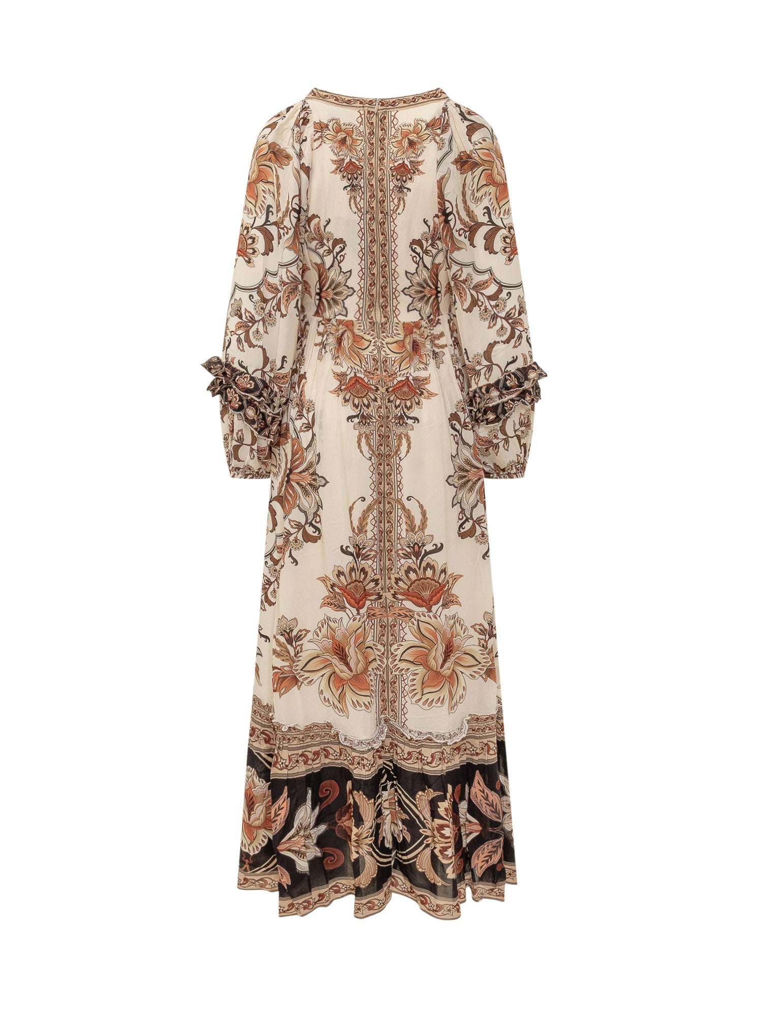 Long dress with floral print and deep V-neckline. Gathered long sleeves and flounced hemline for a flowing silhouette.