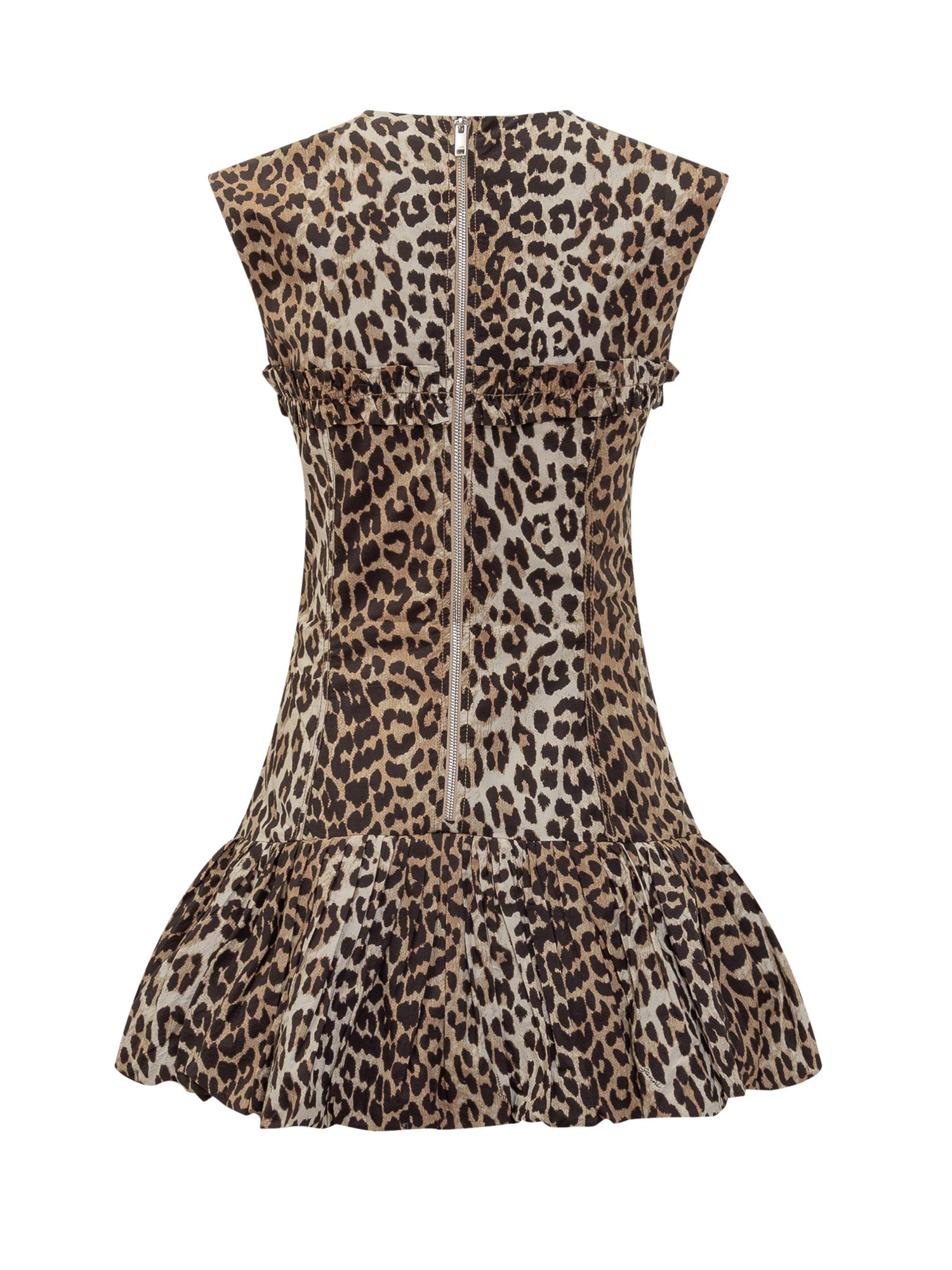 Short dress with integrated corset, structured straps and details such as flap pockets and zippers. Leopard print.