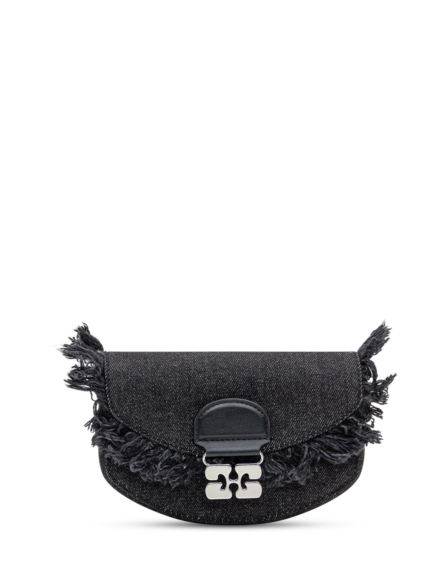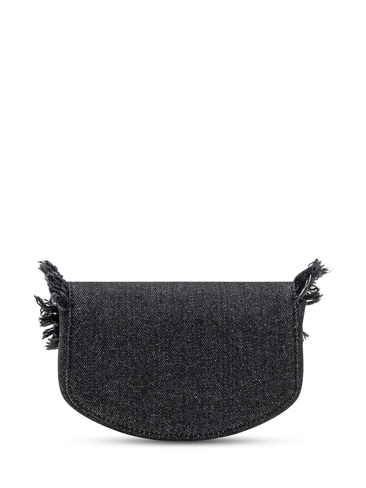 Black bag in fabric. Top folding with magnetic closure. Adjustable and detachable shoulder strap. Plate with logo. Frayed hem.