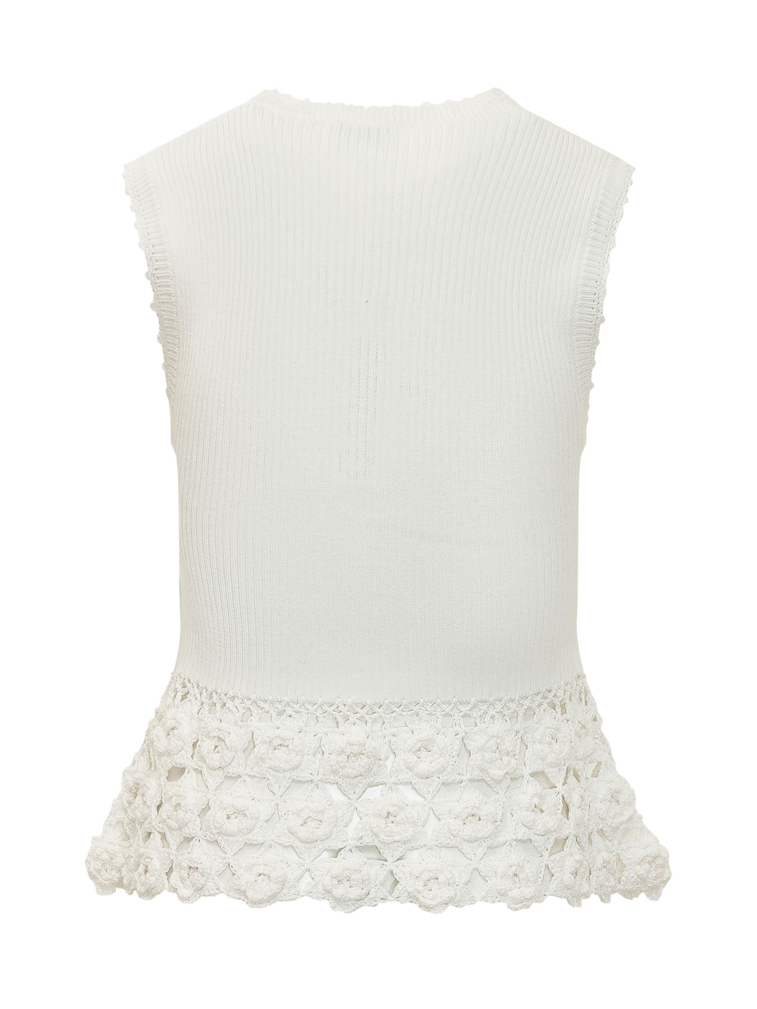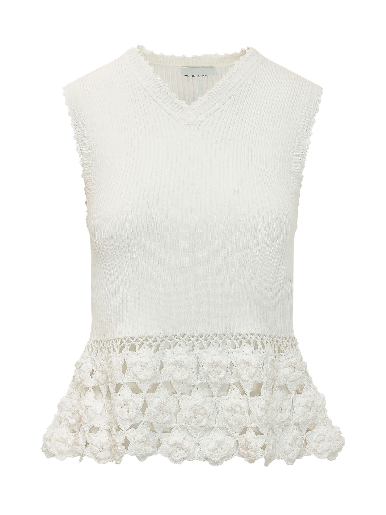 Sleeveless rib knit top with V neck and crochet hem featuring openwork floral pattern