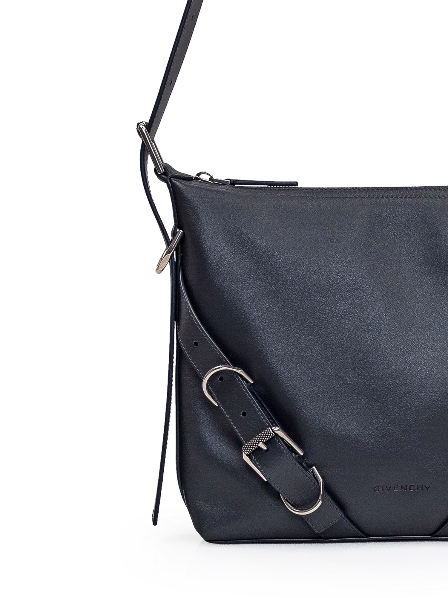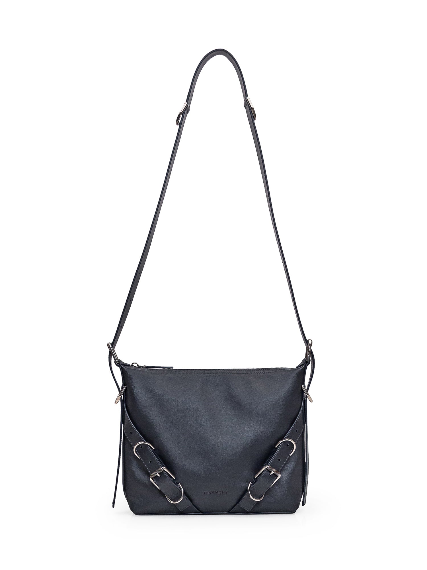 Dark gray leather shoulder bag. Adjustable and removable shoulder strap. One compartment with interior flat pocket. Zipper closure. GIVENCHY signature on front.