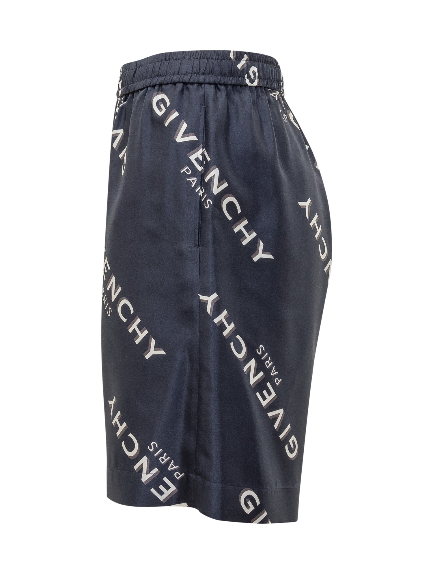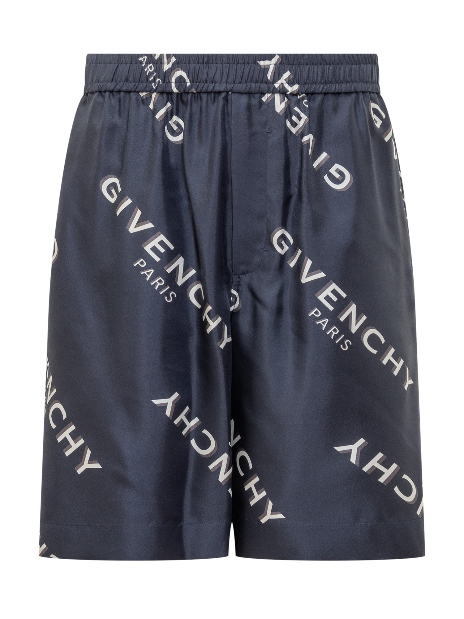 Men's Givenchy shorts in glossy blue silk, featuring all-over white and black logo print. Relaxed fit with elastic waistband for optimal comfort.