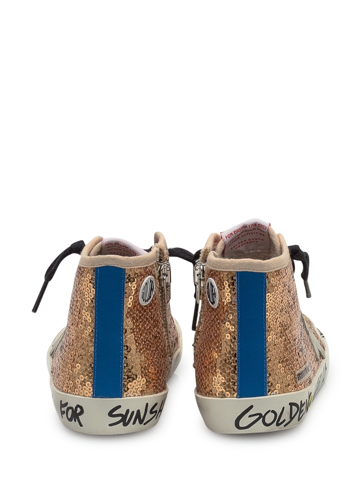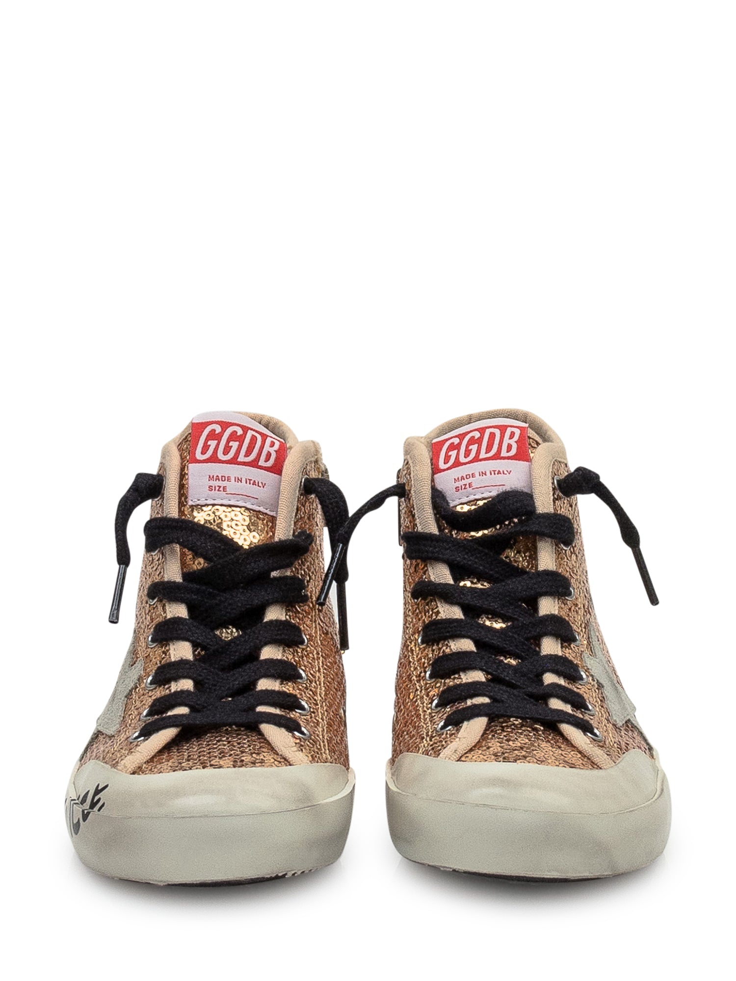 Girls high-top sneakers with gold sequins, side star and distressed details.