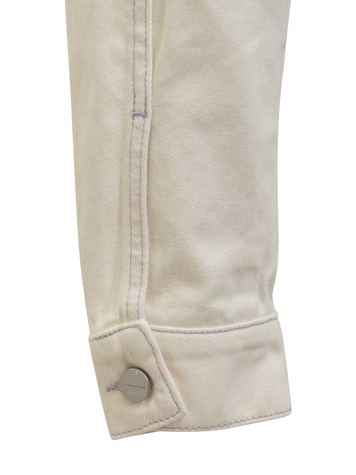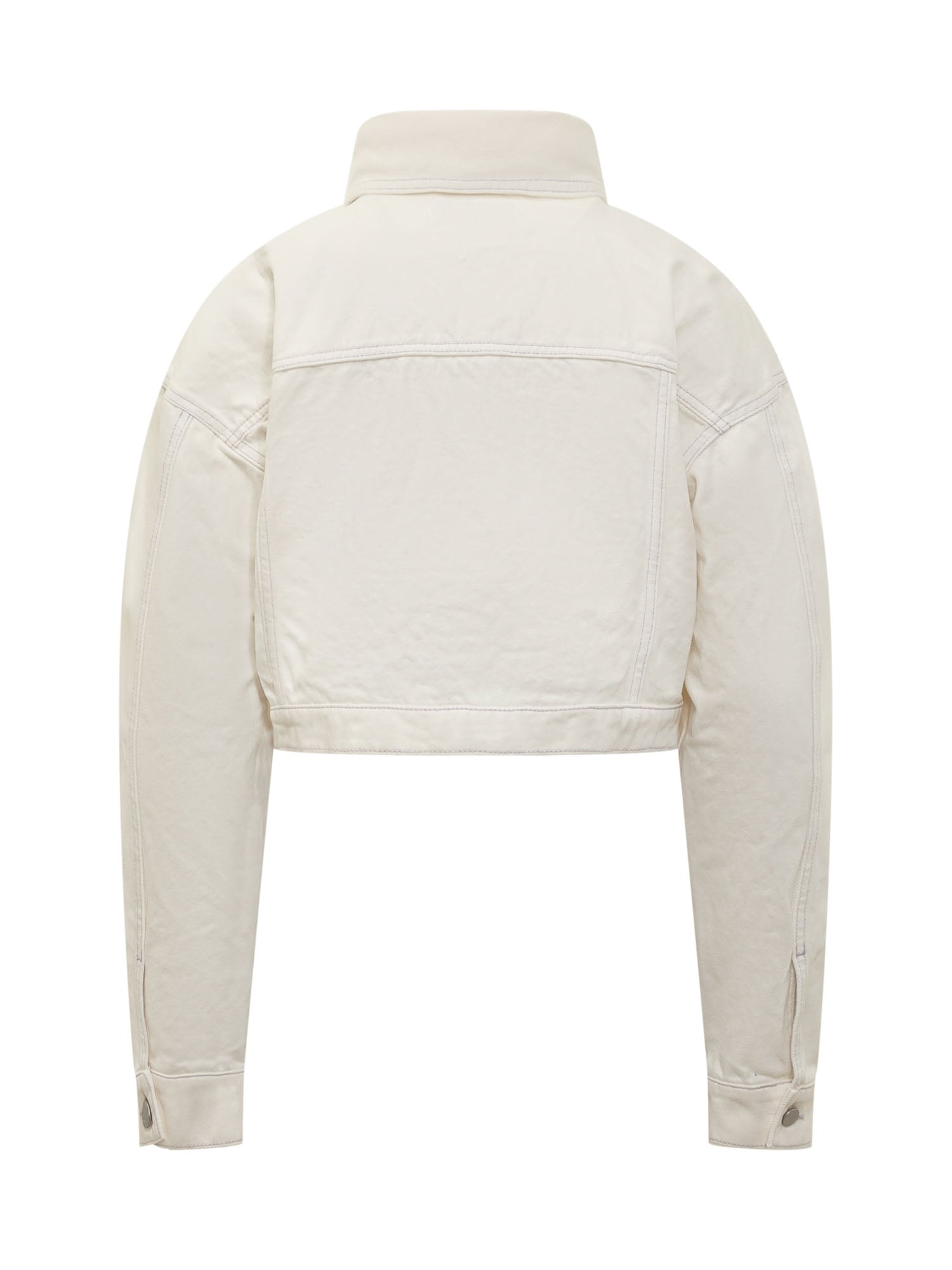 Cropped denim jacket. Classic collar. Button closure. Cuffs with button. Two pockets with button on the front. Tape applied inside the left pocket. Contrast stitching.