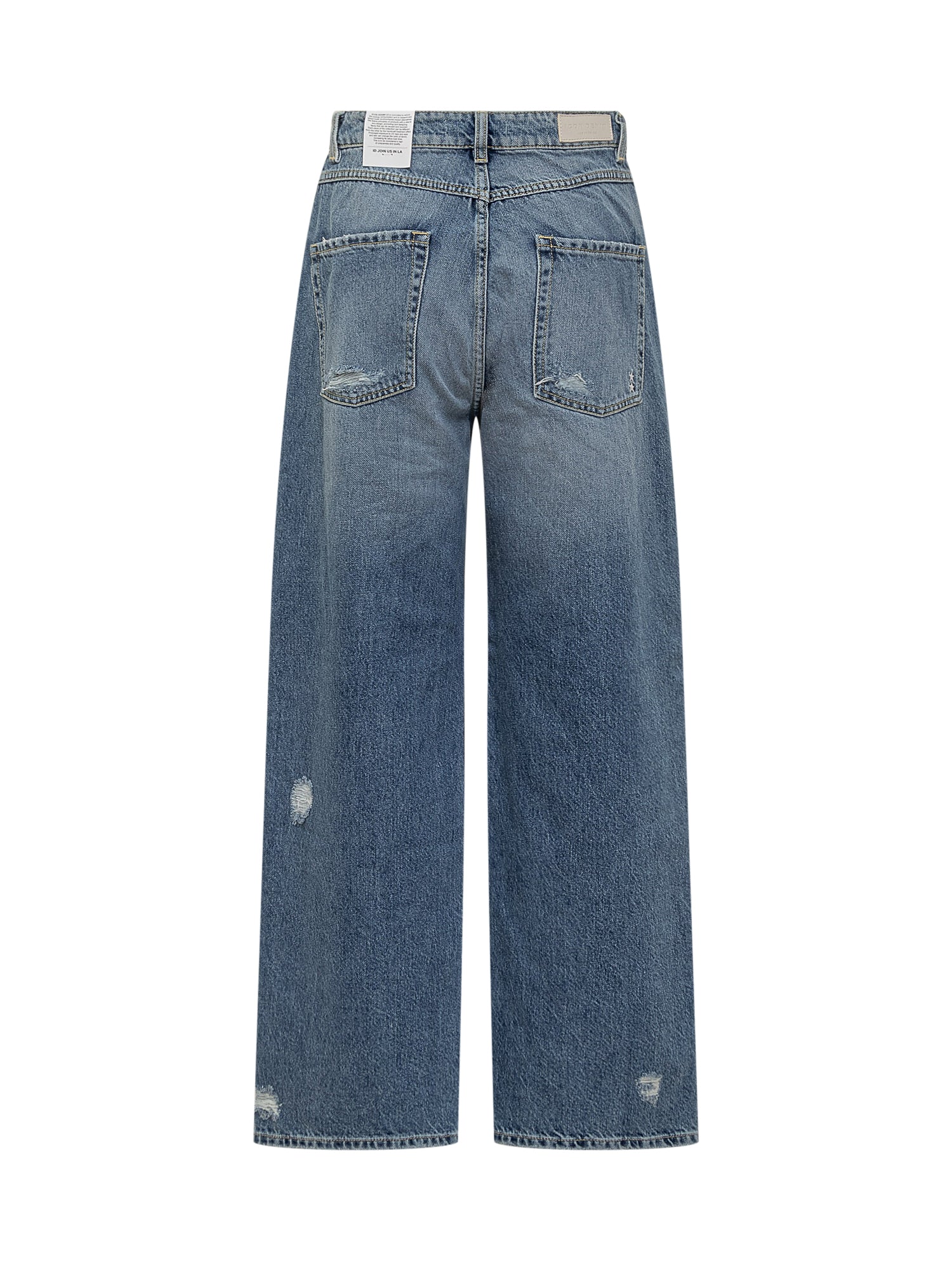 Wide leg jeans. Zipper and button closure. Belt loops. Five pockets. All-over ruined effect.