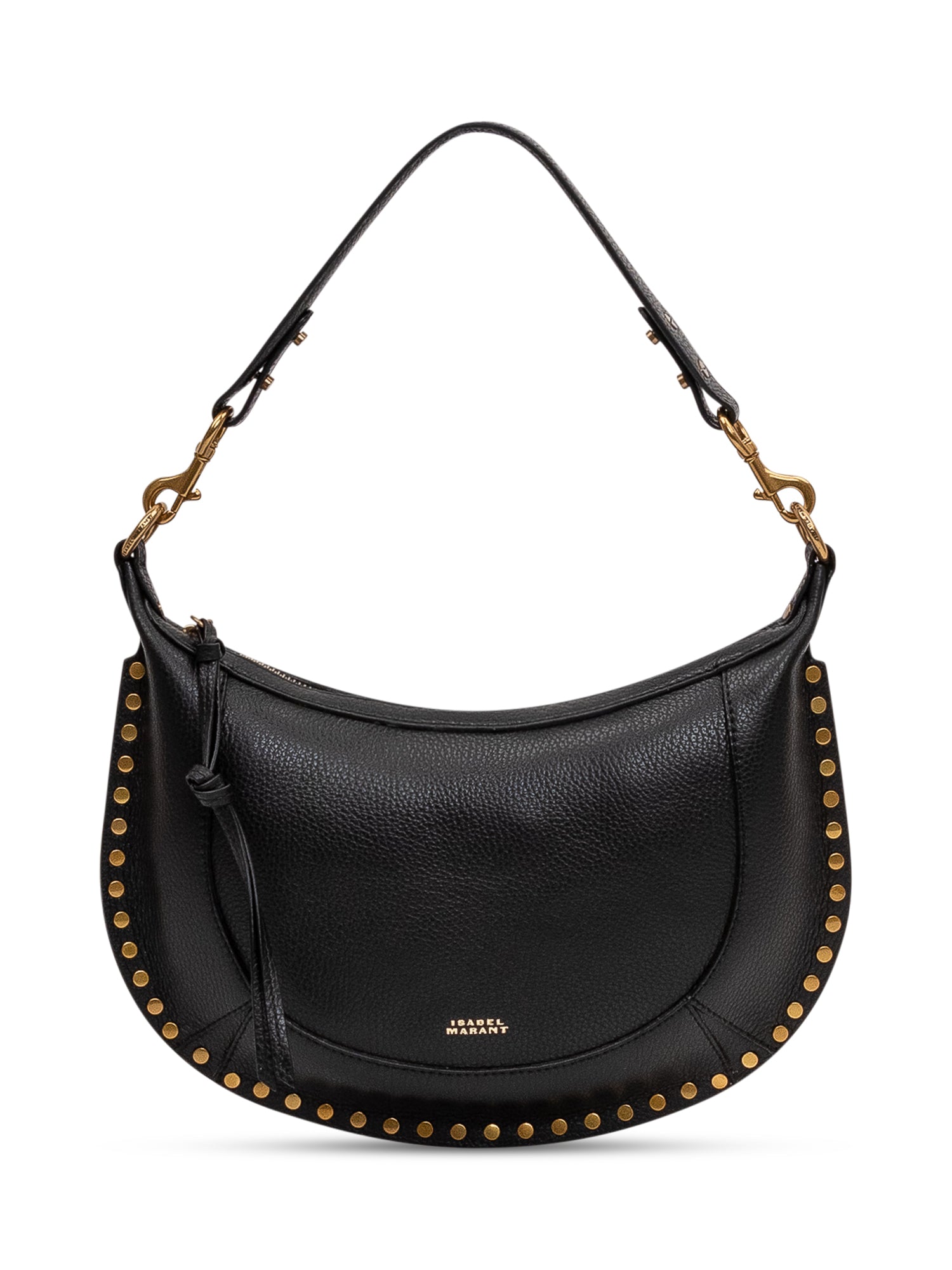 Shoulder bag with top zip closure and adjustable handle. Metal studs applied along the edge and semicircular structure.