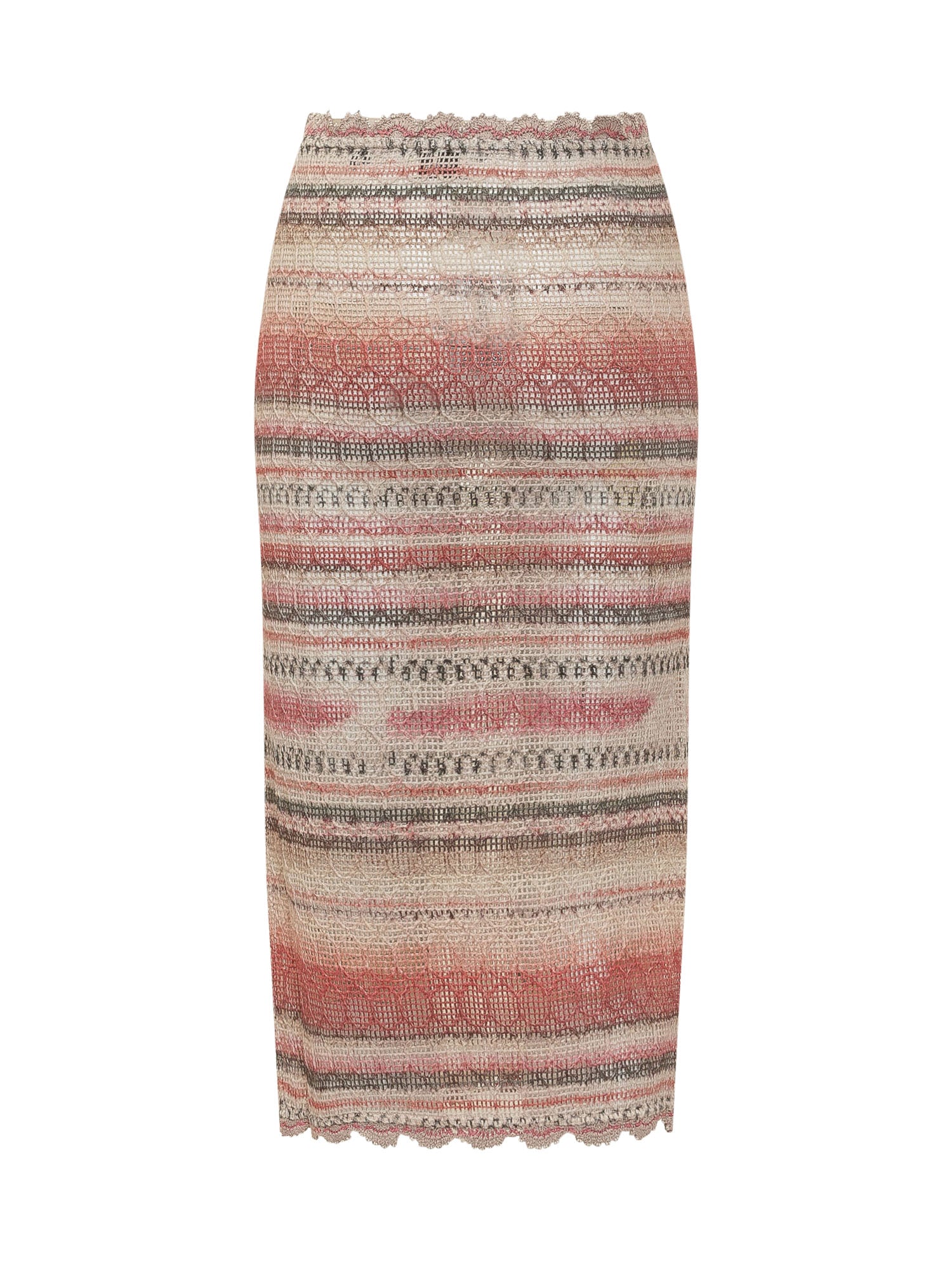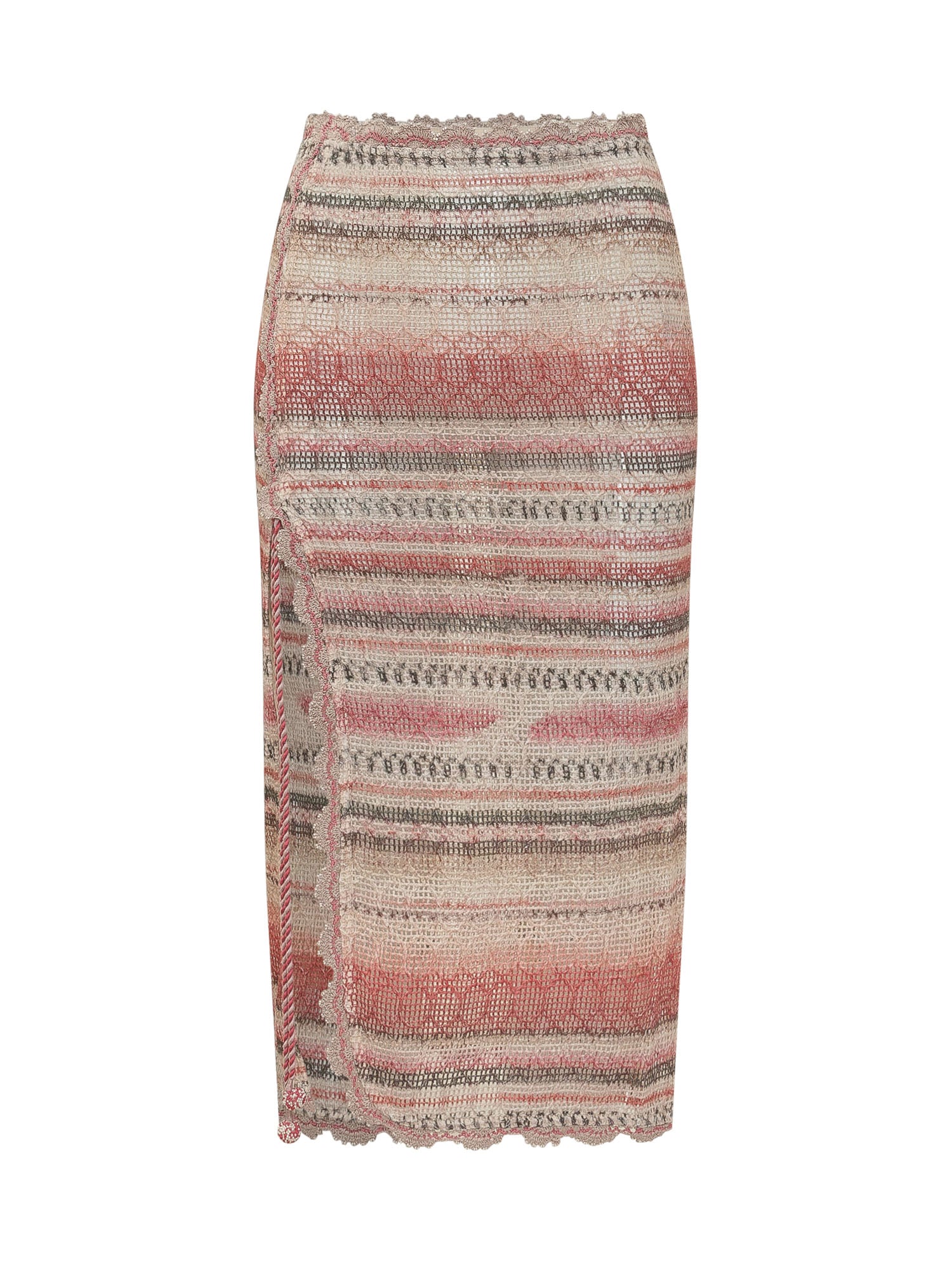 Boho-style midi skirt with multicolor striped pattern. Elastic waistband with slightly scalloped edge and side slit with decorative tie detail. Lightweight fabric with slim fit and below-the-knee length.