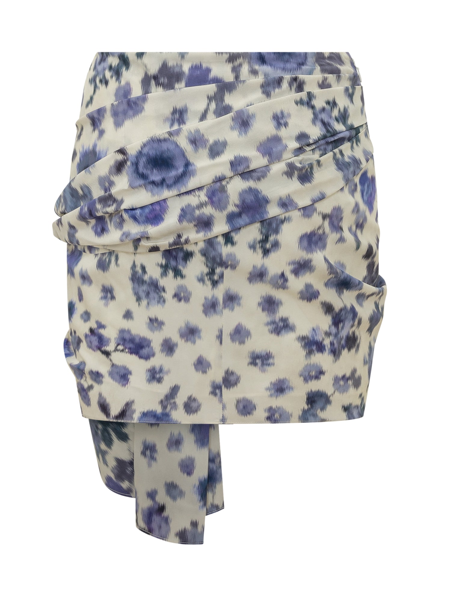 Draped mini skirt with side knot and abstract print. Its wrapped silhouette adds movement and delivers a modern.