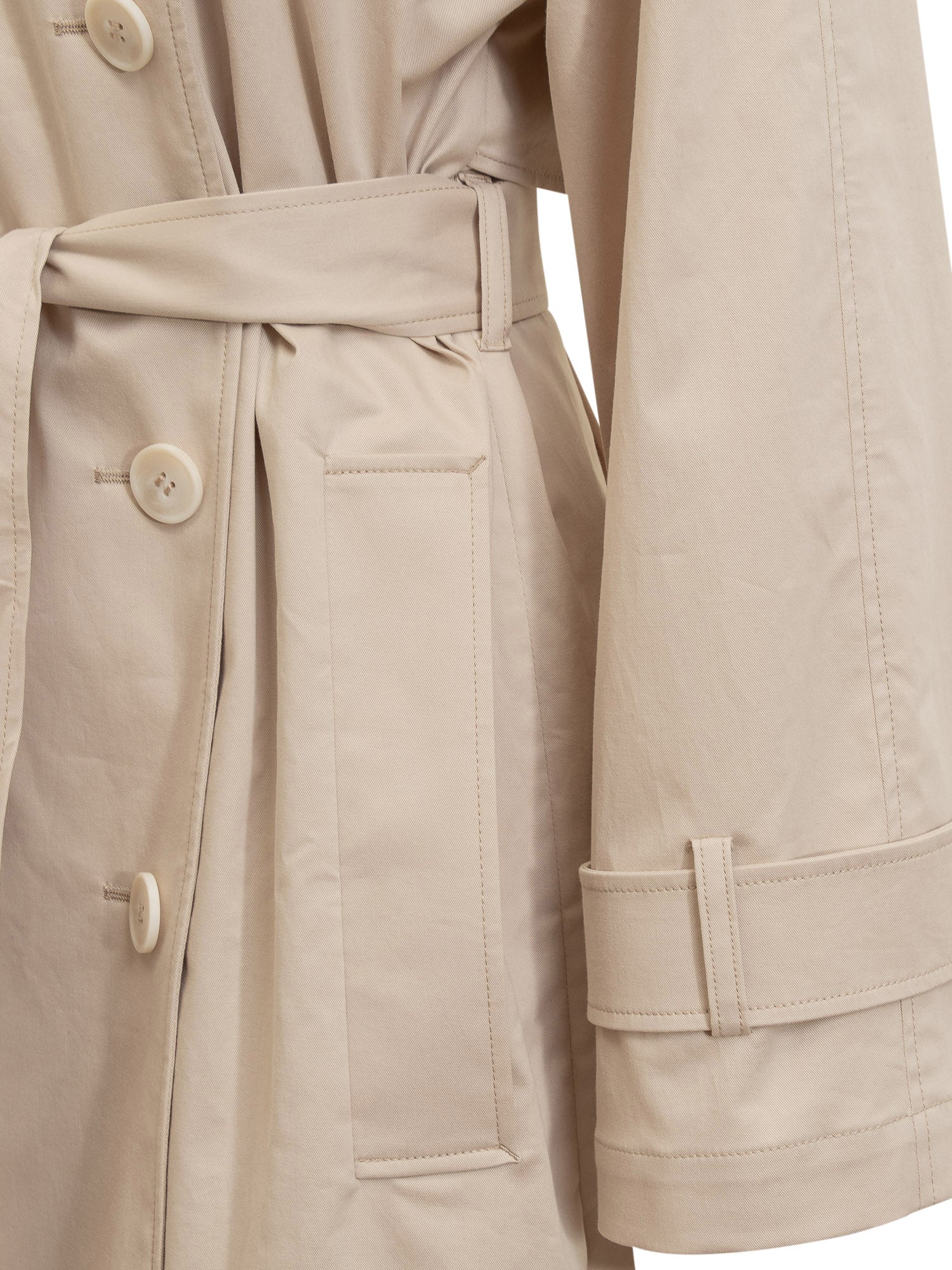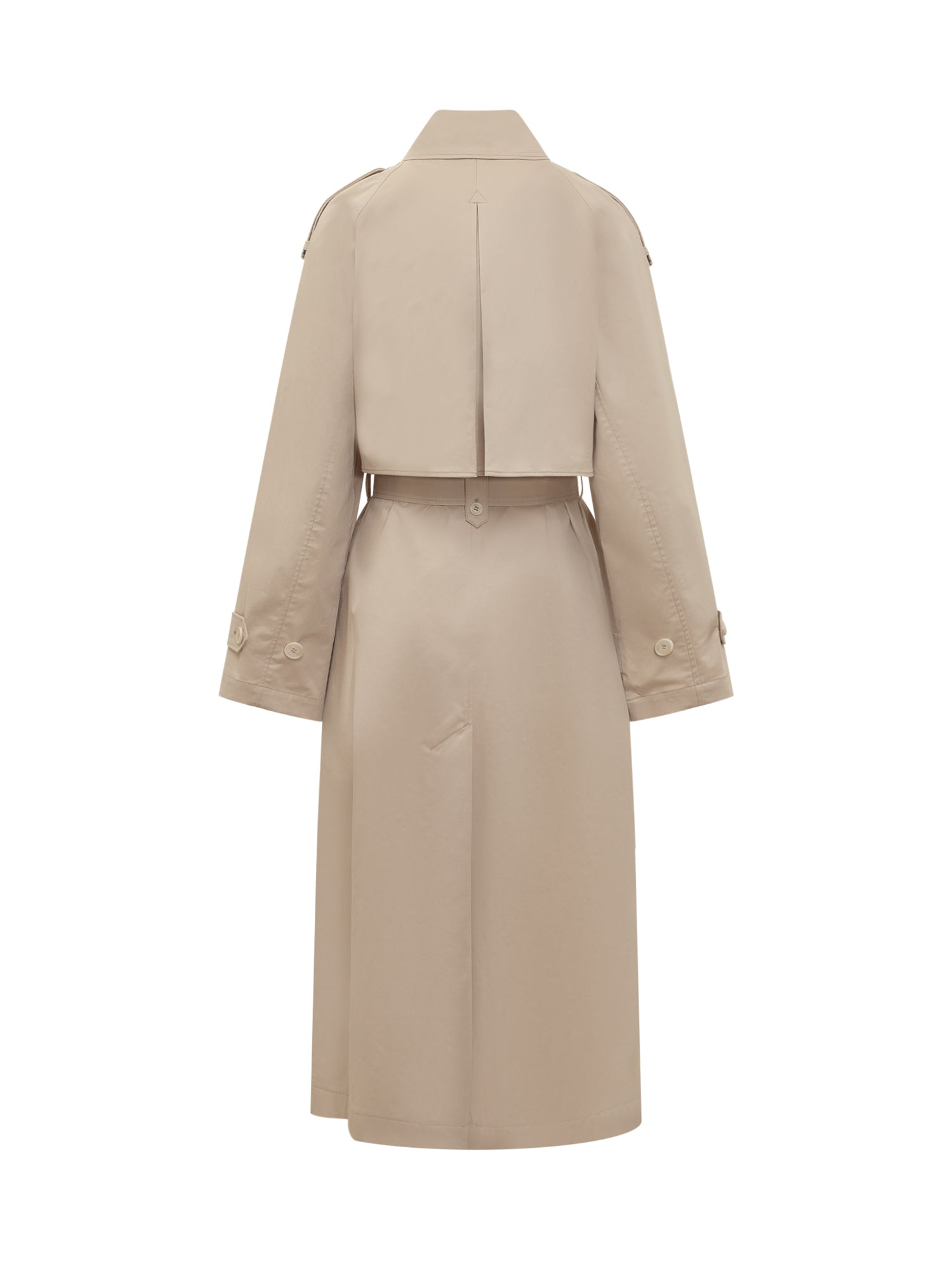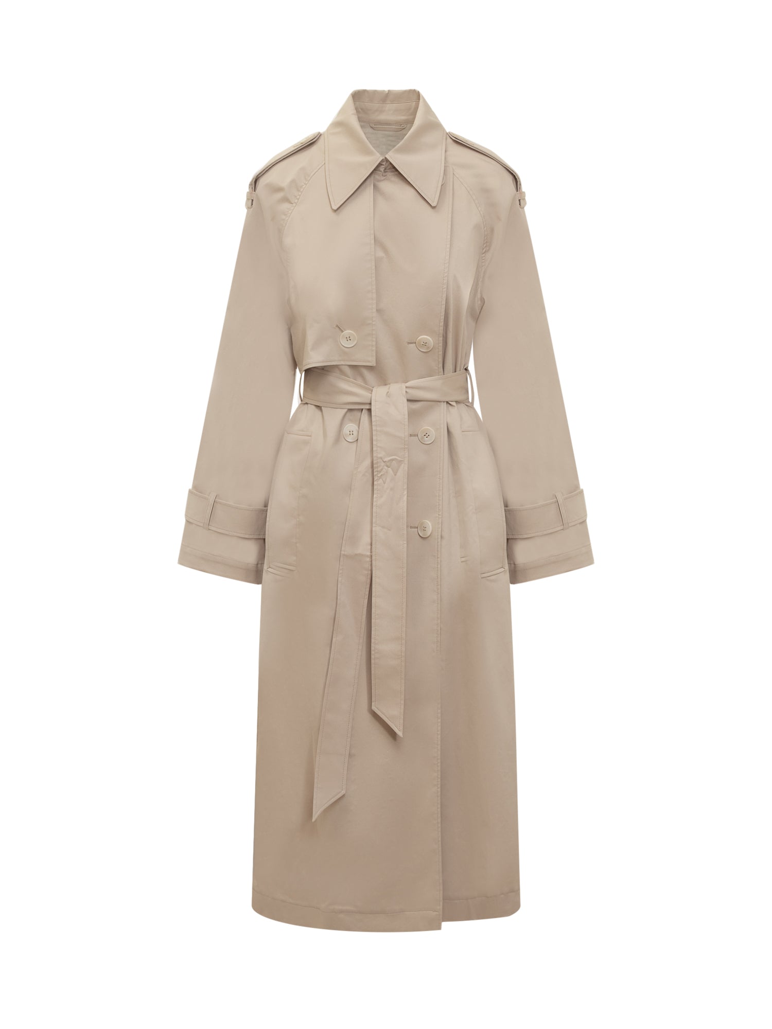 Long double-breasted trench coat with long sleeves. Classic collar. Button closure. Waist belt. Belt and button cuffs.