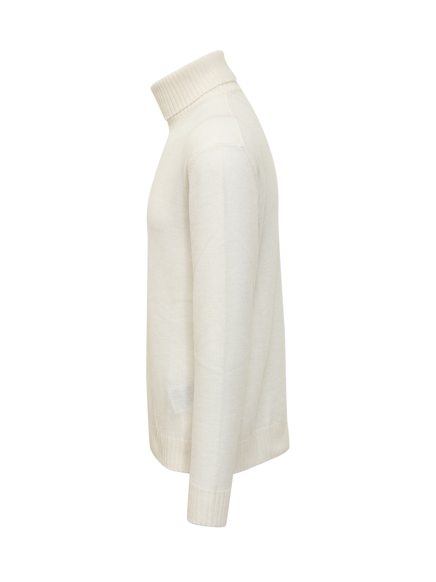 Long-sleeved wool sweater. High collar. Stretch ribbed hems. Embroidered logo on front.