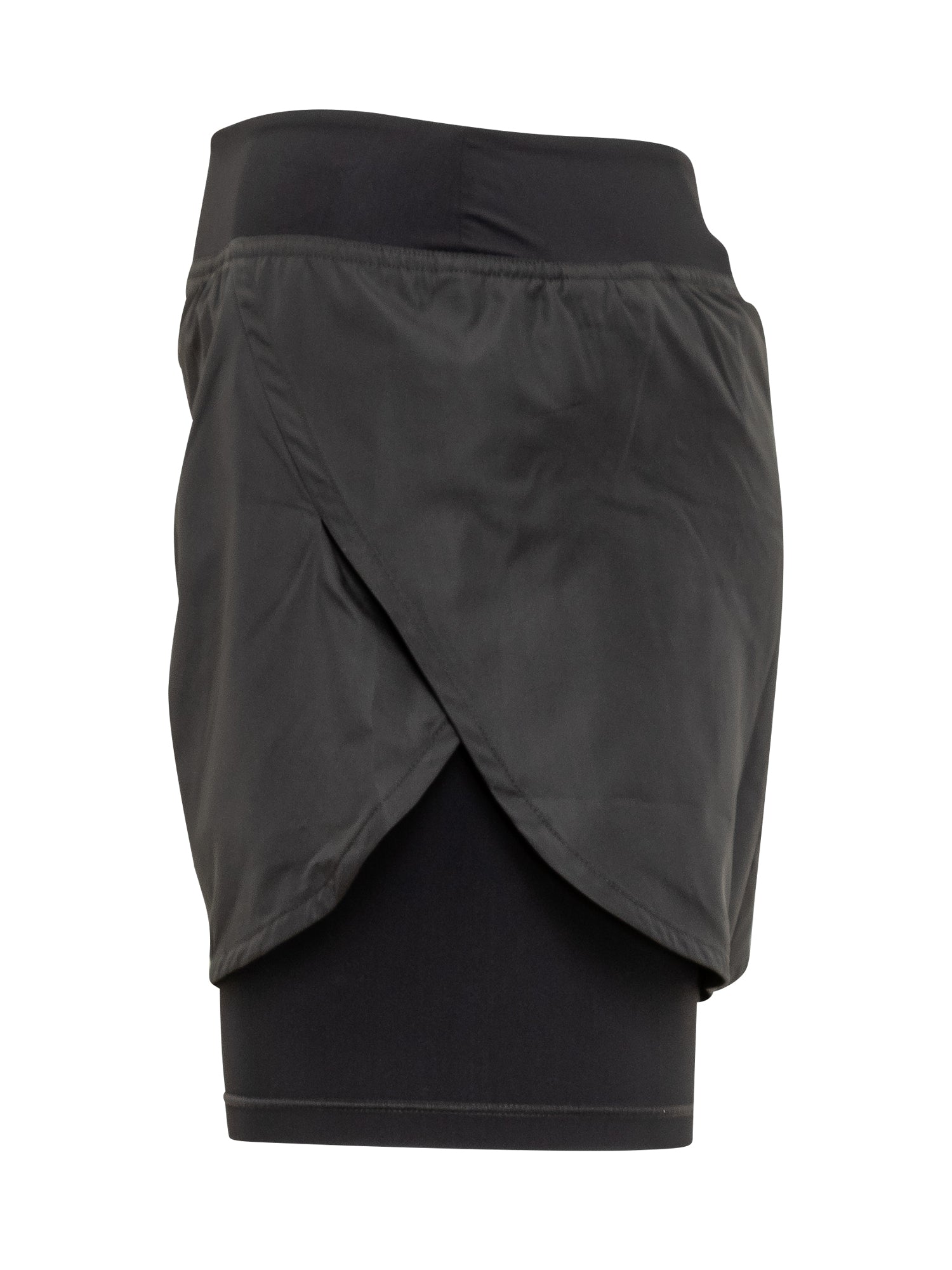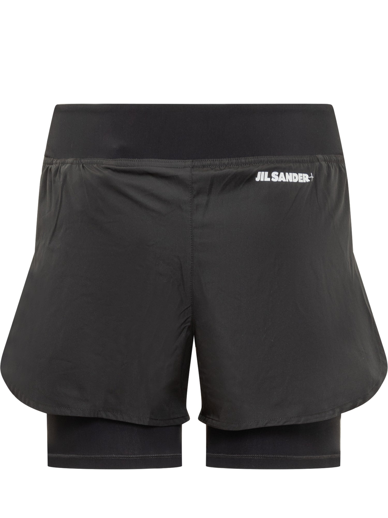 Black jogger shorts. Elastic waistband. Logo on the back. Fitted and stretchy shorts underneath.