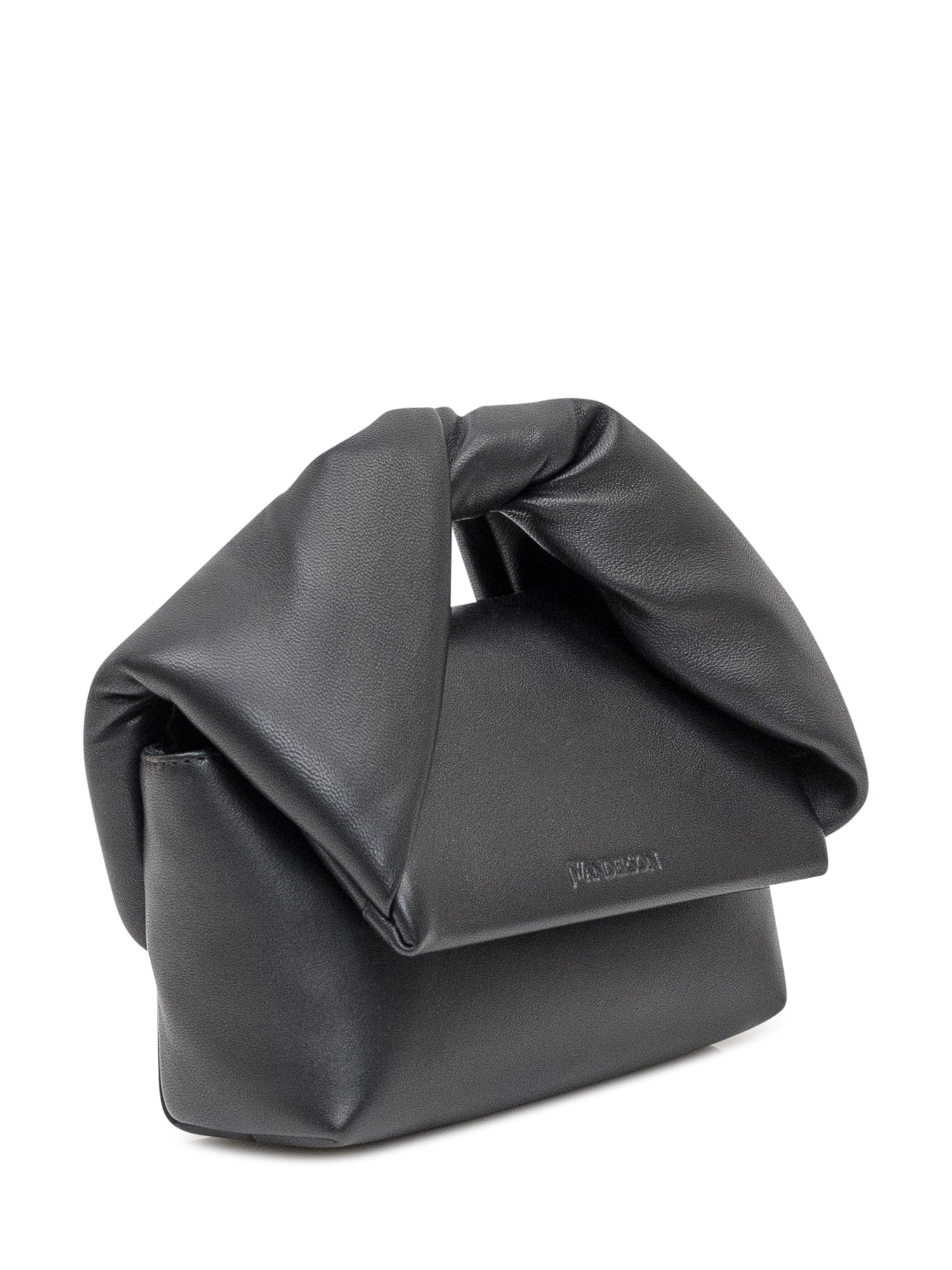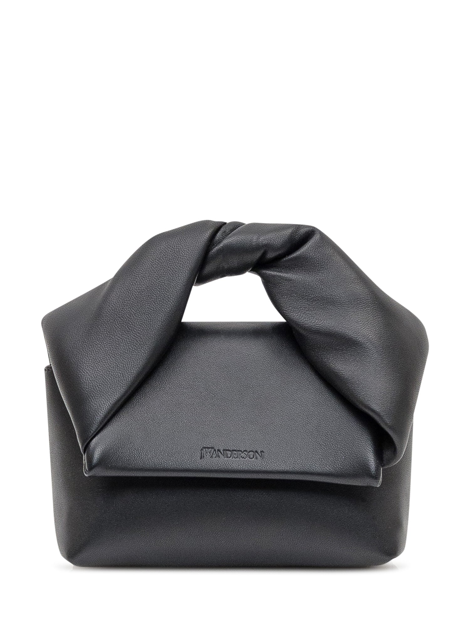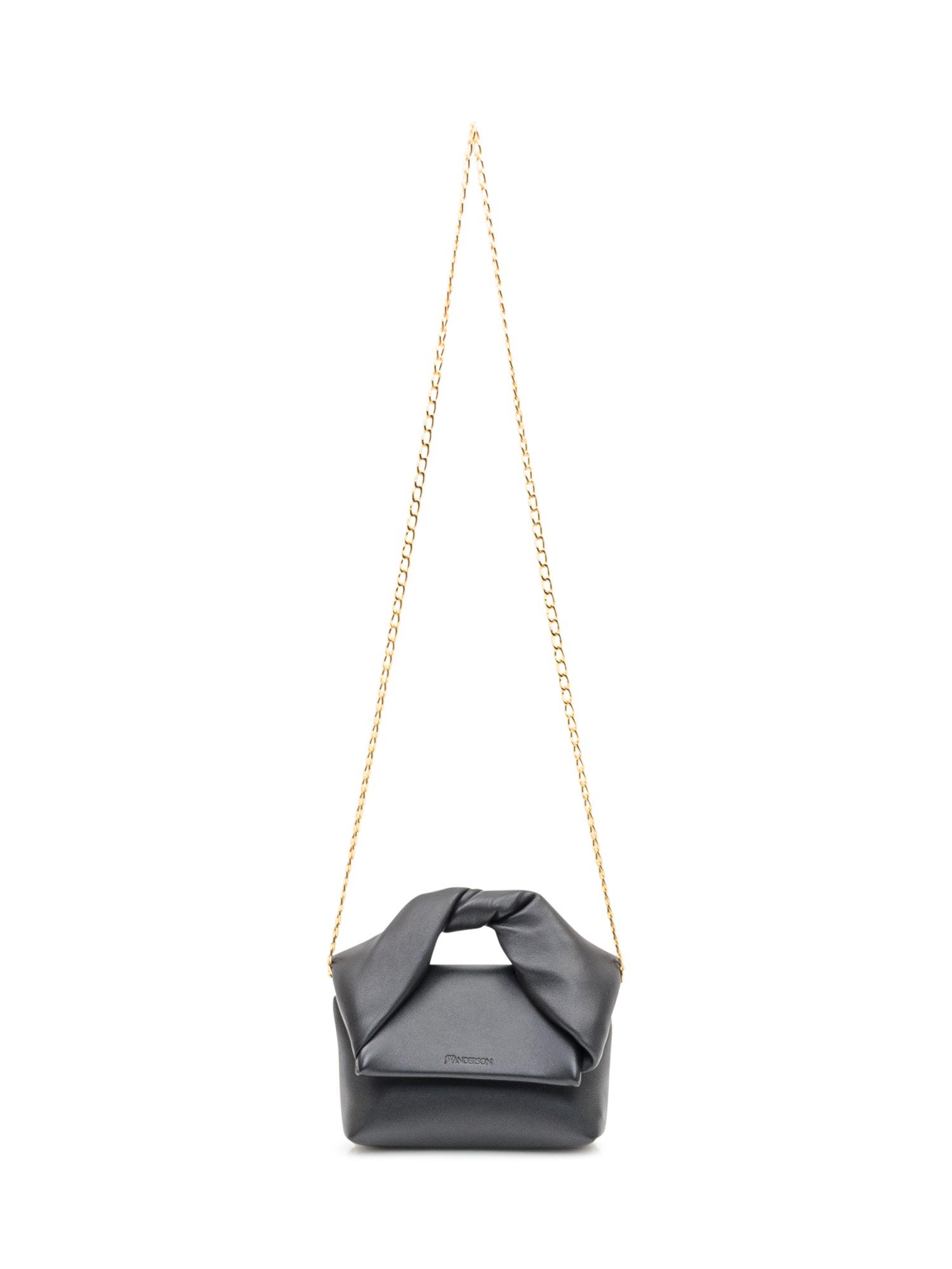 Black leather bag with twisted handle design. Logo engraved. Chain shoulder strap. Hinged top with magnetic closure. Internal pocket applied.