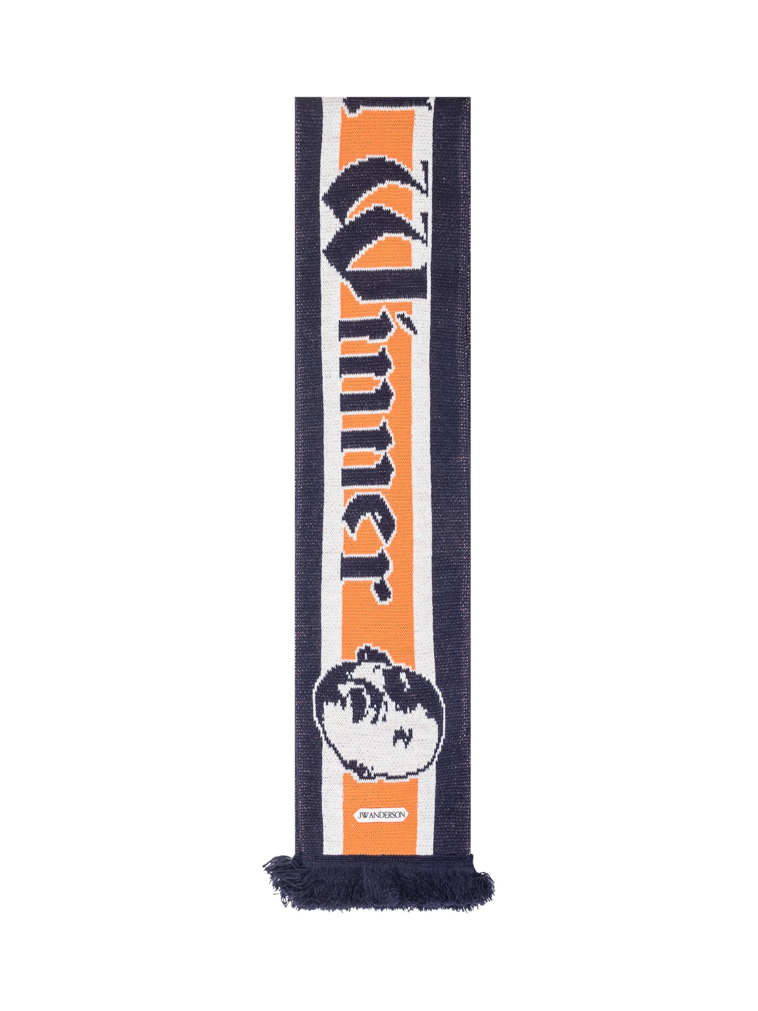 Long scarf featuring a bold graphic design with contrasting vertical stripes and central lettering.